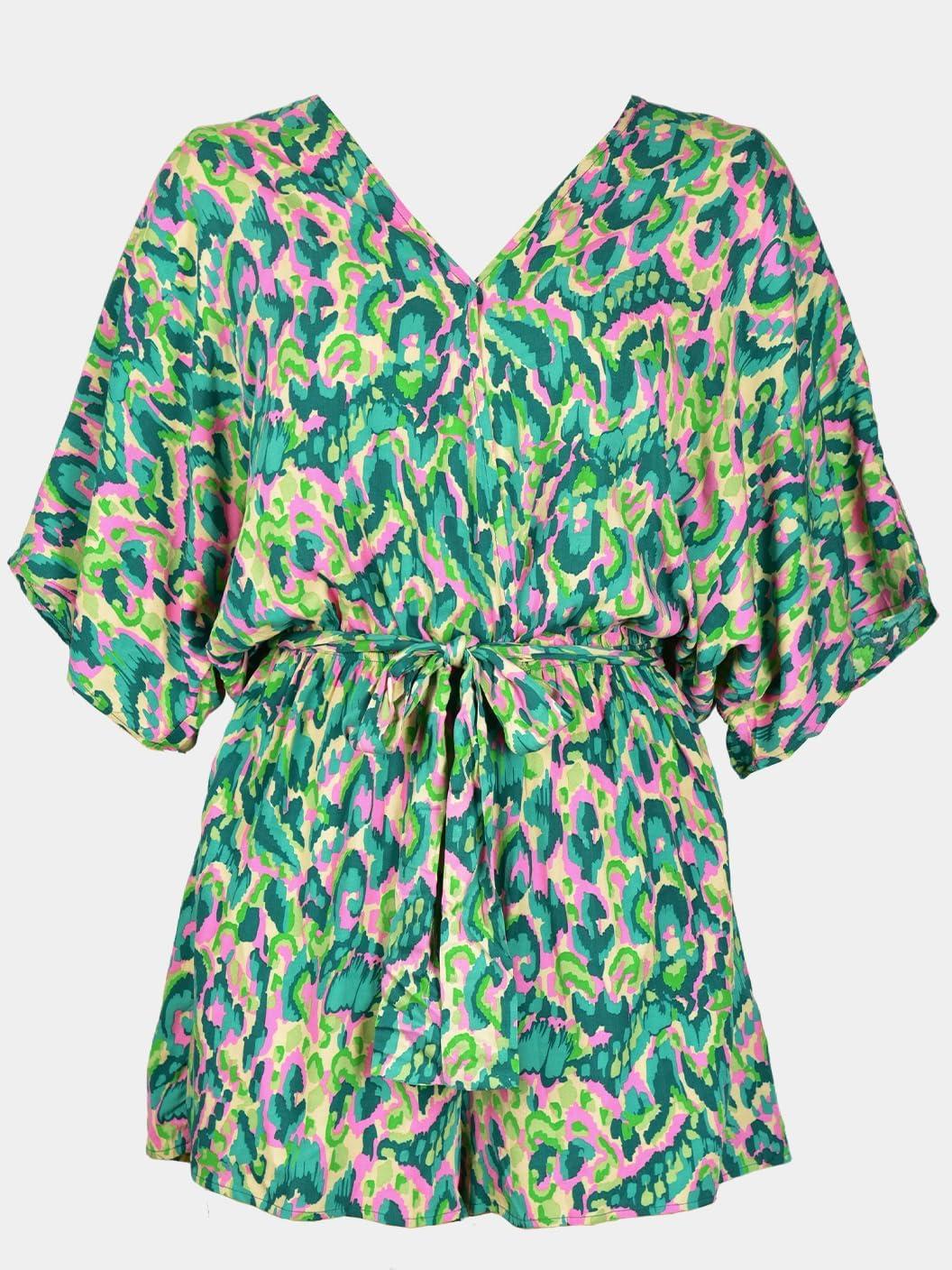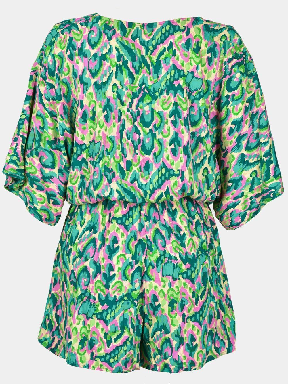 CUPSHE Women’s Summer Romper Lace Up Printed Half Sleeves Casual Wide leg Vacation Outfit Mini One Piece Jumpsuit(Green)