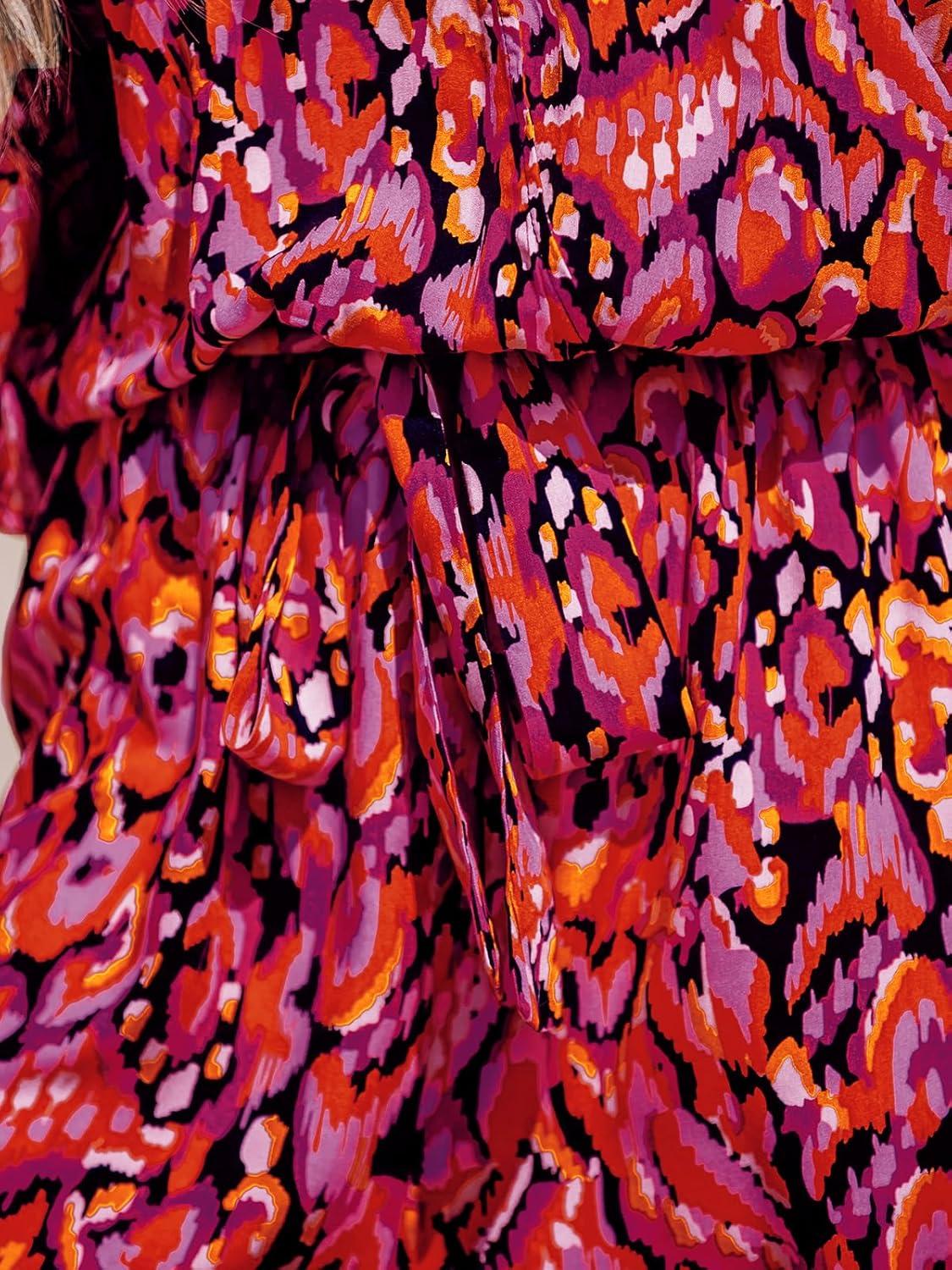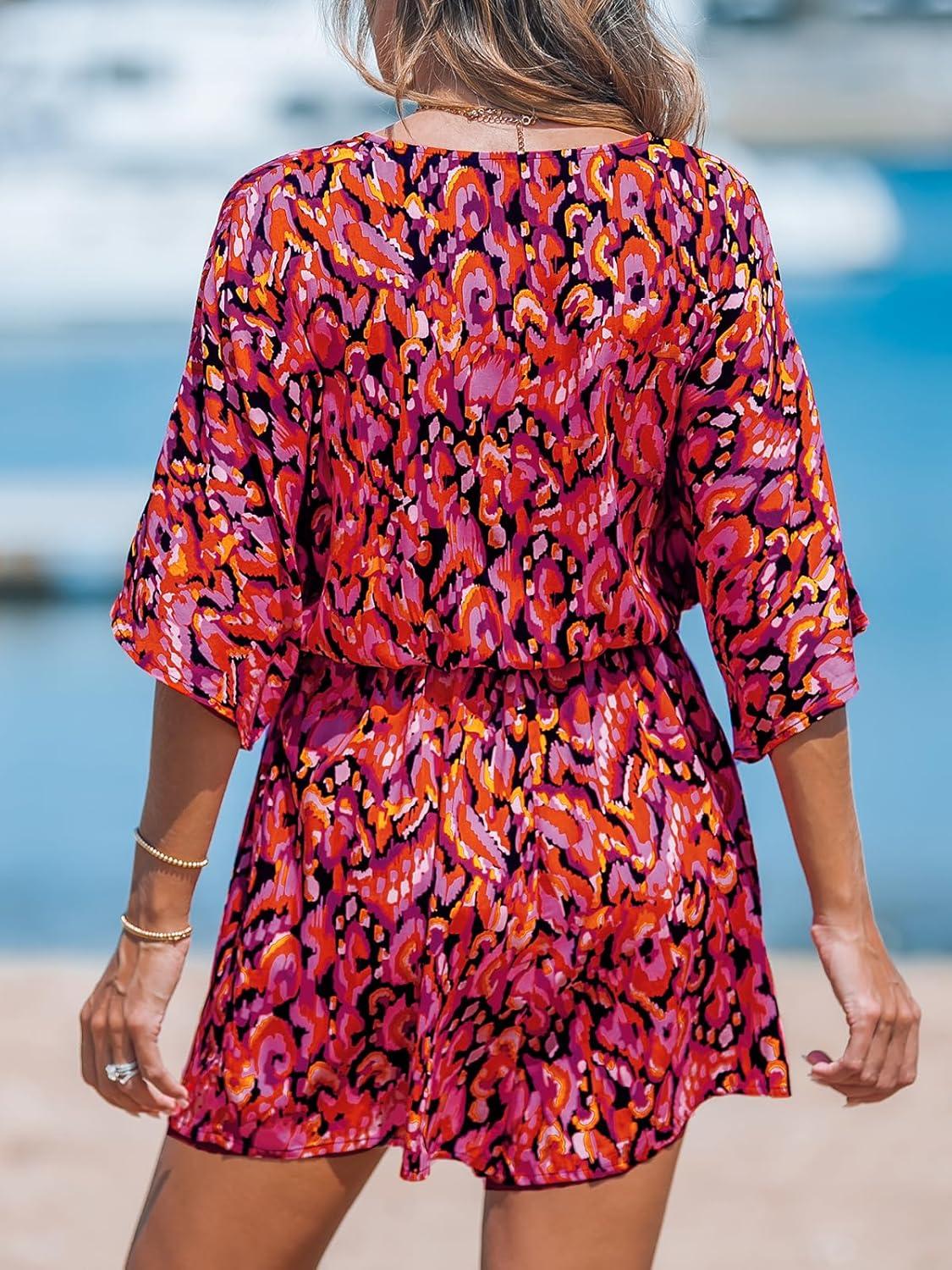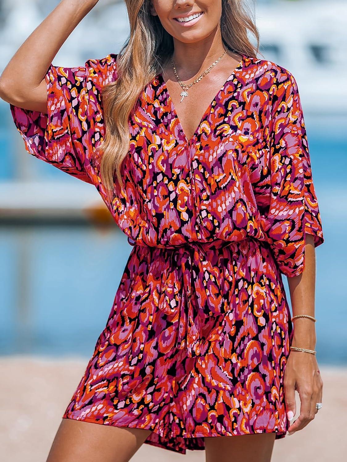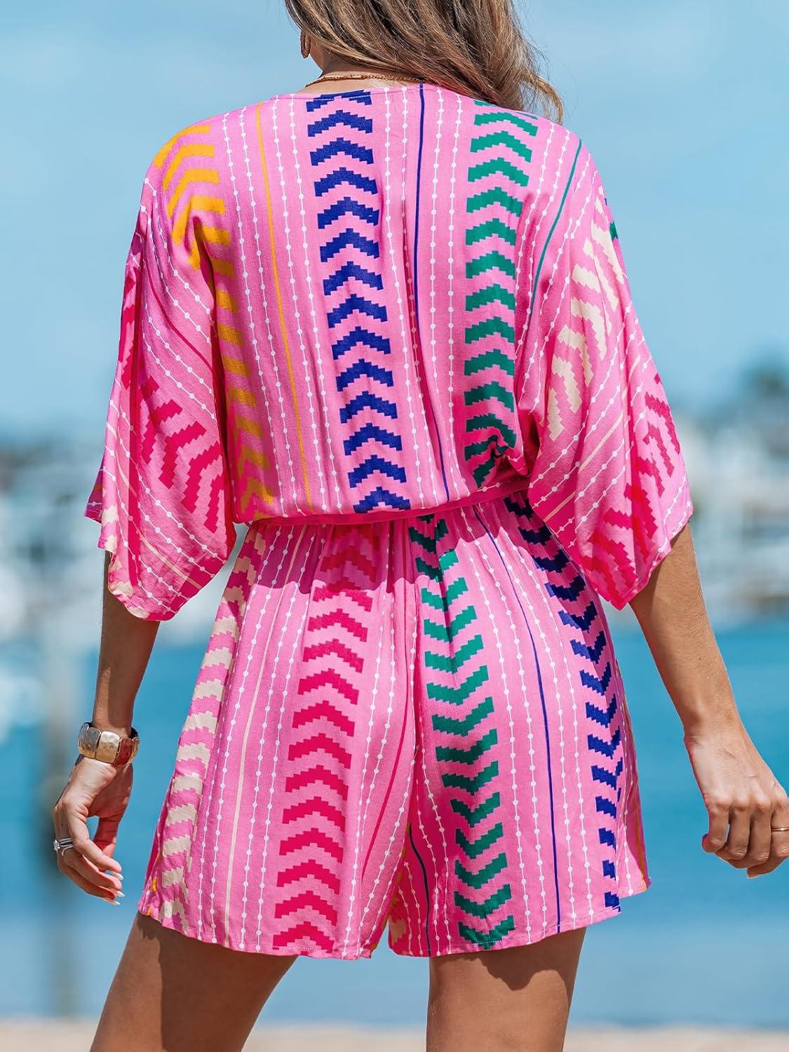 CUPSHE Women’s Summer Romper Lace Up Printed Half Sleeves Casual Wide leg Vacation Outfit Mini One Piece Jumpsuit(Fuchsia)