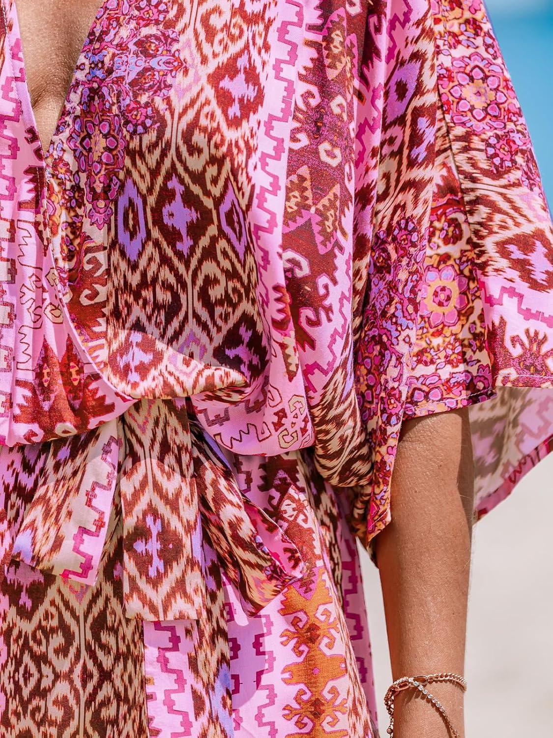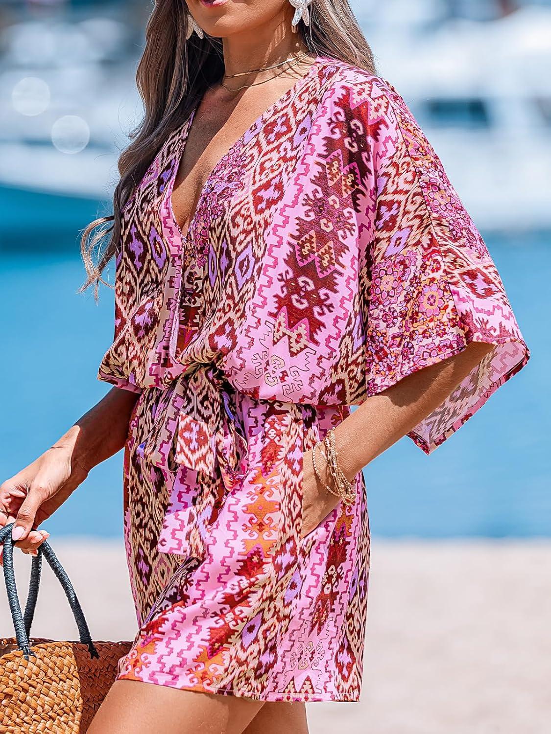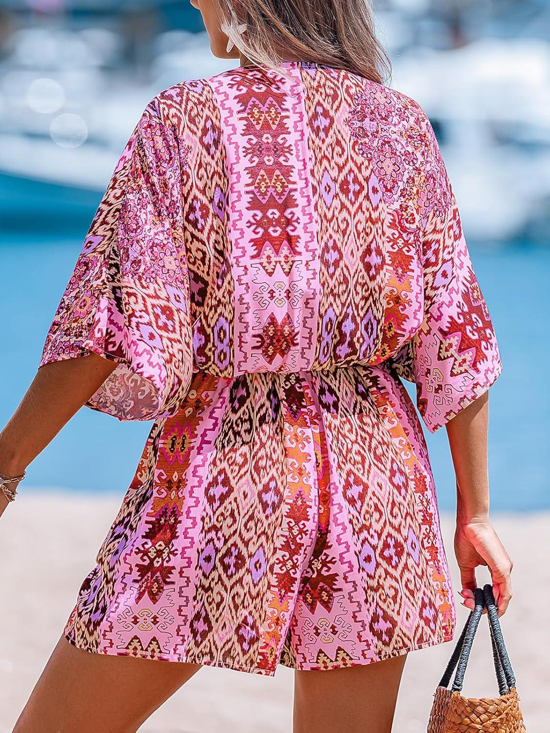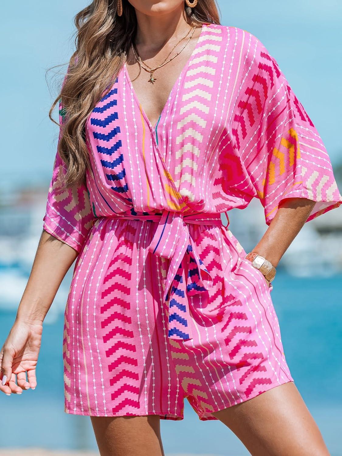CUPSHE Women’s Summer Romper Lace Up Printed Half Sleeves Casual Wide leg Vacation Outfit Mini One Piece Jumpsuit(Pink Abstract)