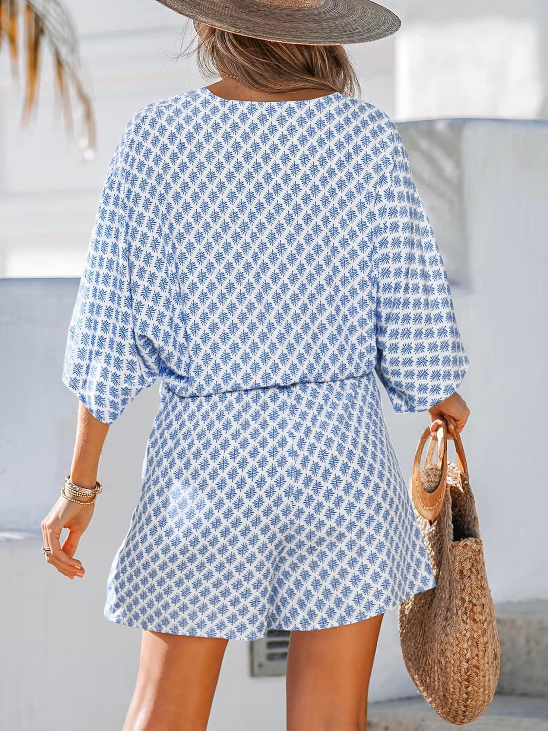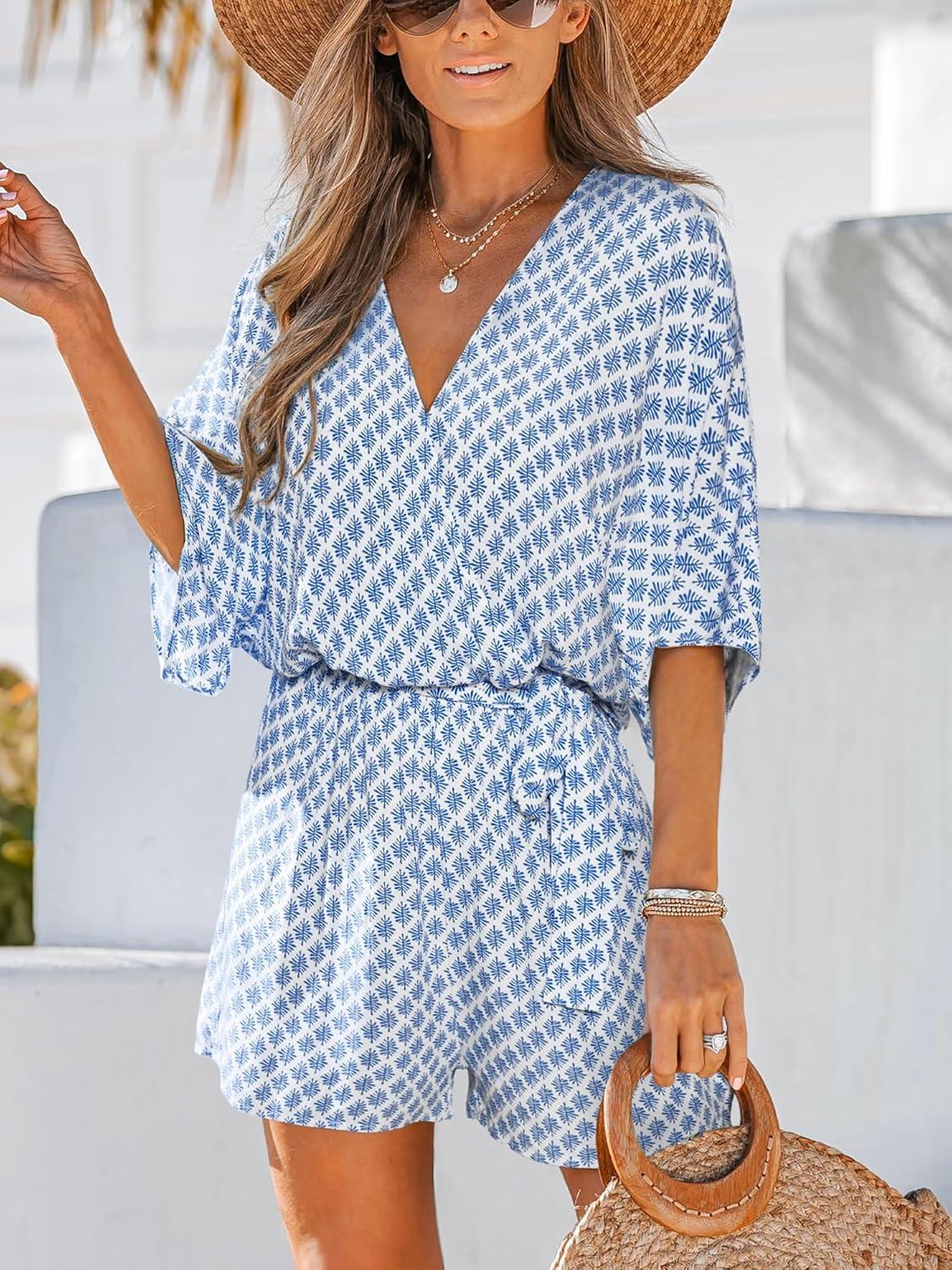 CUPSHE Women’s Summer Romper Lace Up Printed Half Sleeves Casual Wide leg Vacation Outfit Mini One Piece Jumpsuit(Blue)