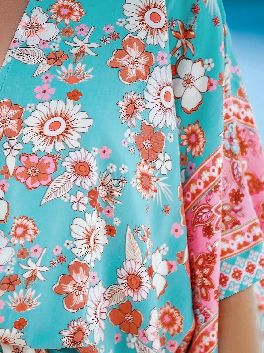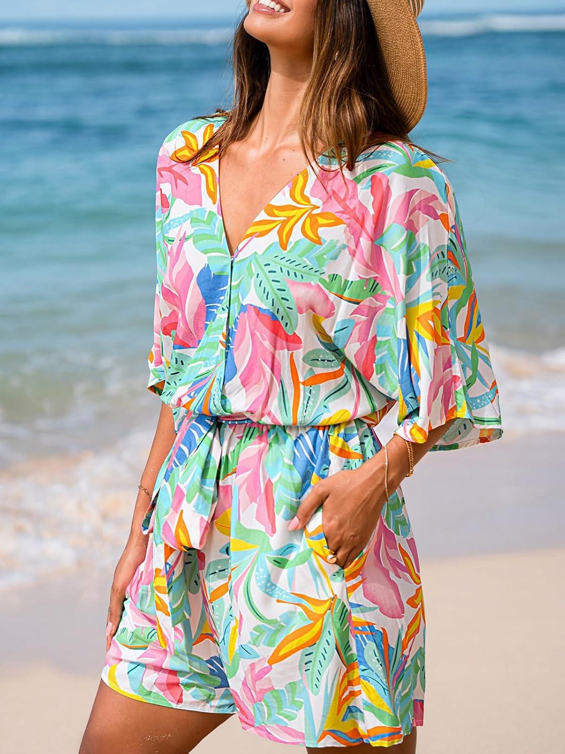 CUPSHE Women’s Summer Romper Lace Up Printed Half Sleeves Casual Wide leg Vacation Outfit Mini One Piece Jumpsuit(Mint-pink)