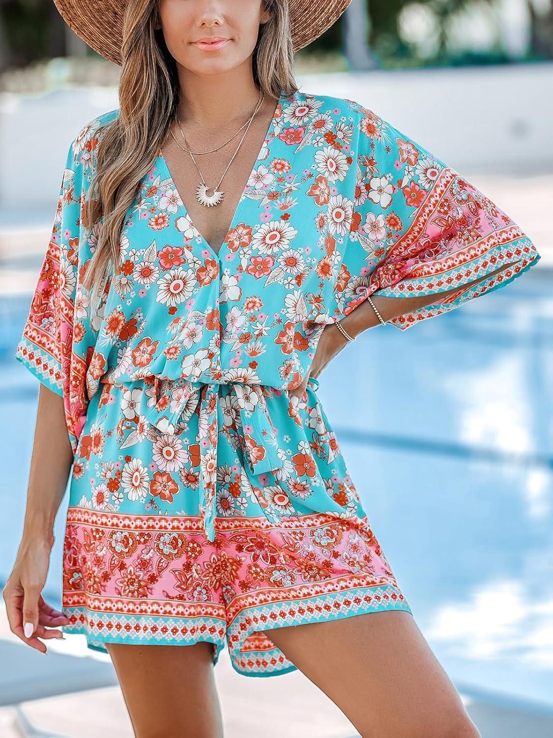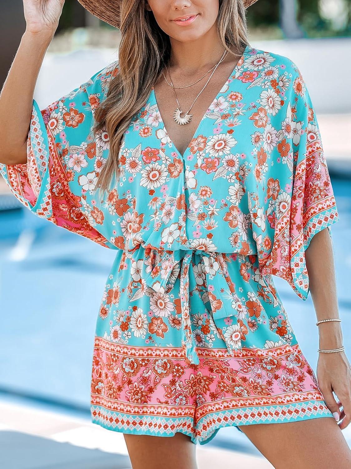 CUPSHE Women’s Summer Romper Lace Up Printed Half Sleeves Casual Wide leg Vacation Outfit Mini One Piece Jumpsuit(Mint Floral)