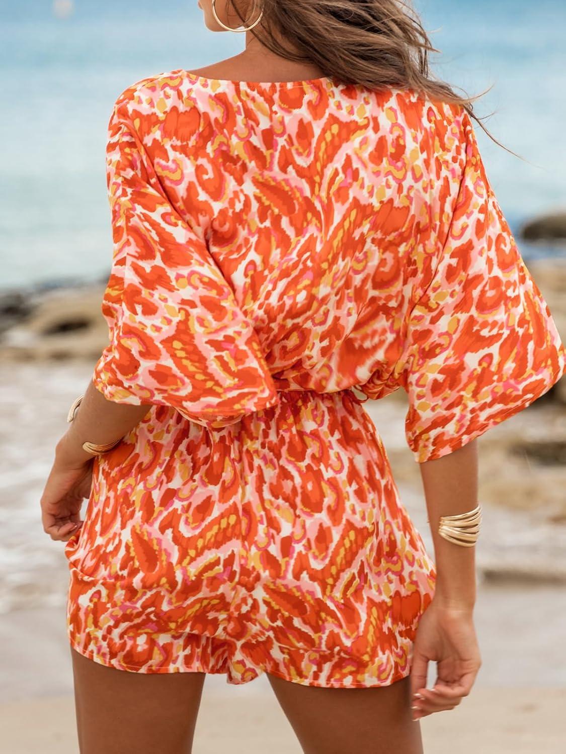 CUPSHE Women’s Summer Romper Lace Up Printed Half Sleeves Casual Wide leg Vacation Outfit Mini One Piece Jumpsuit(Orange)