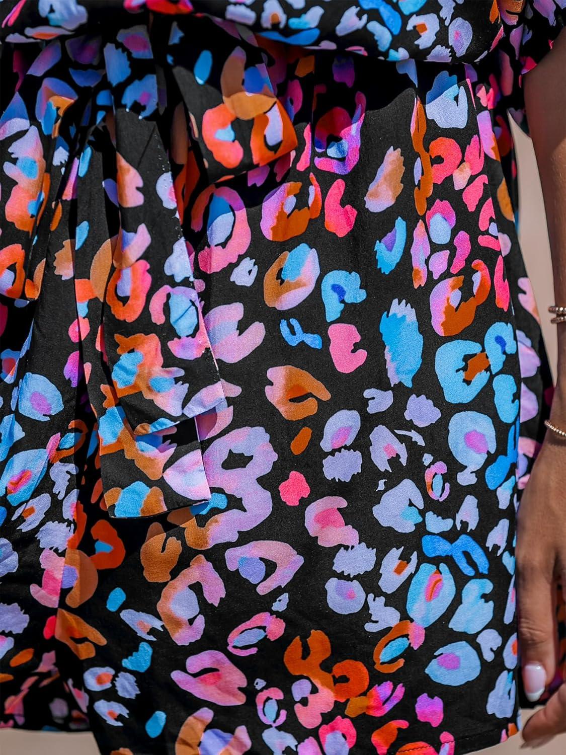 CUPSHE Women’s Summer Romper Lace Up Printed Half Sleeves Casual Wide leg Vacation Outfit Mini One Piece Jumpsuit(Black Leopard)