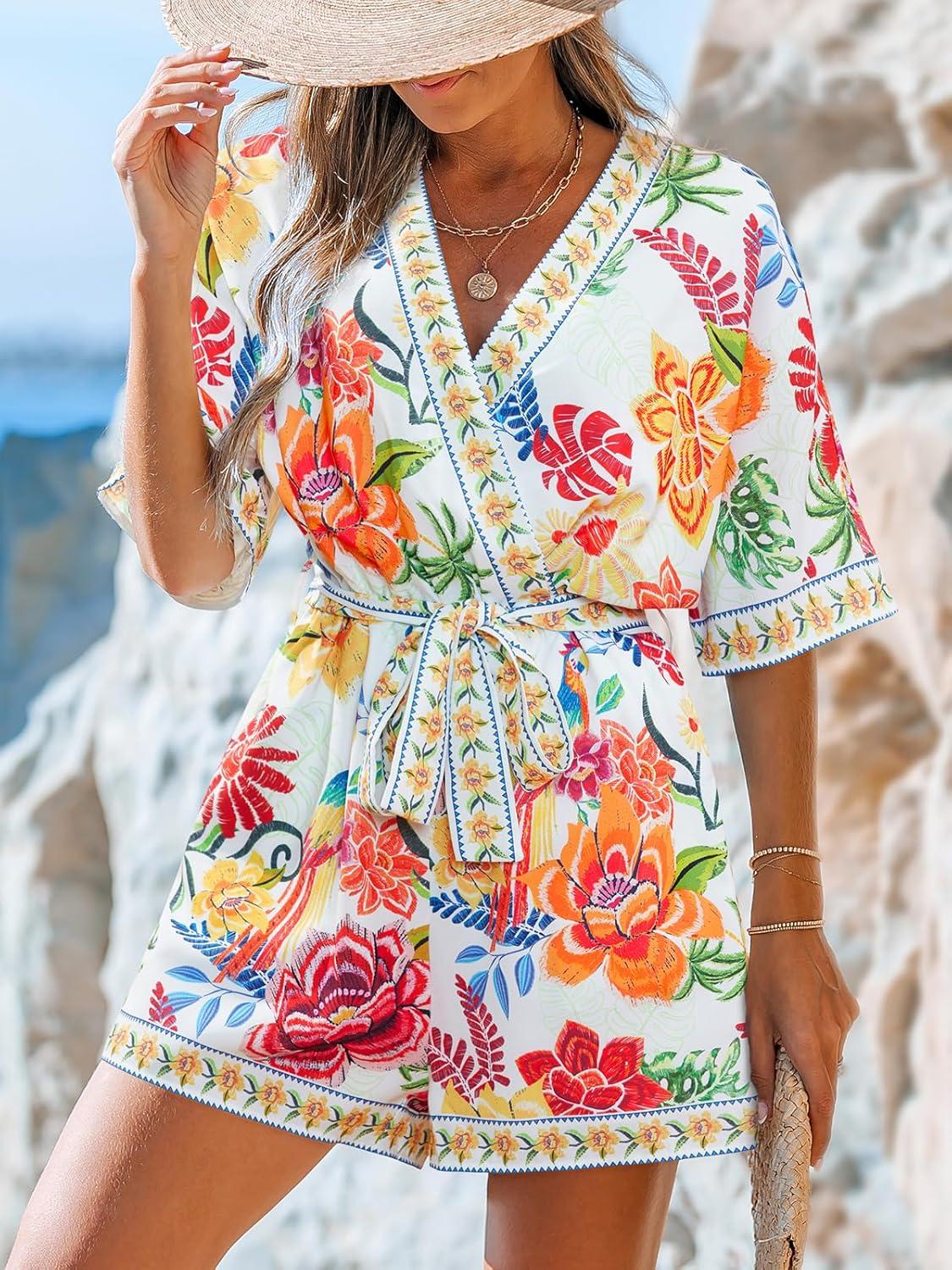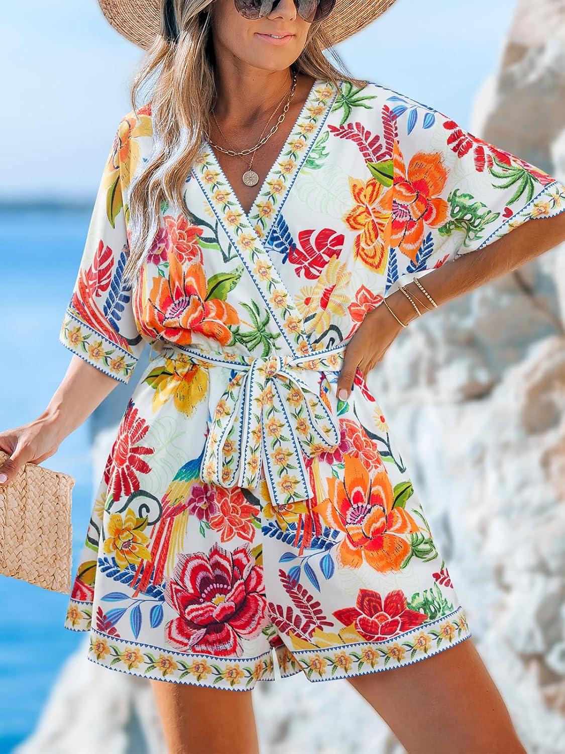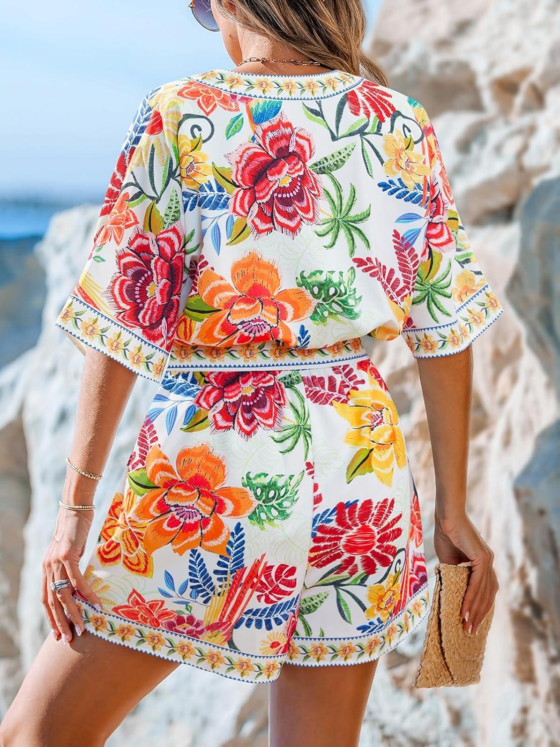 CUPSHE Women’s Summer Romper Lace Up Printed Half Sleeves Casual Wide leg Vacation Outfit Mini One Piece Jumpsuit(Red Floral)