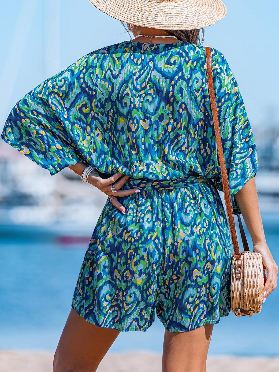 CUPSHE Women’s Summer Romper Lace Up Printed Half Sleeves Casual Wide leg Vacation Outfit Mini One Piece Jumpsuit(Teal Abstract)