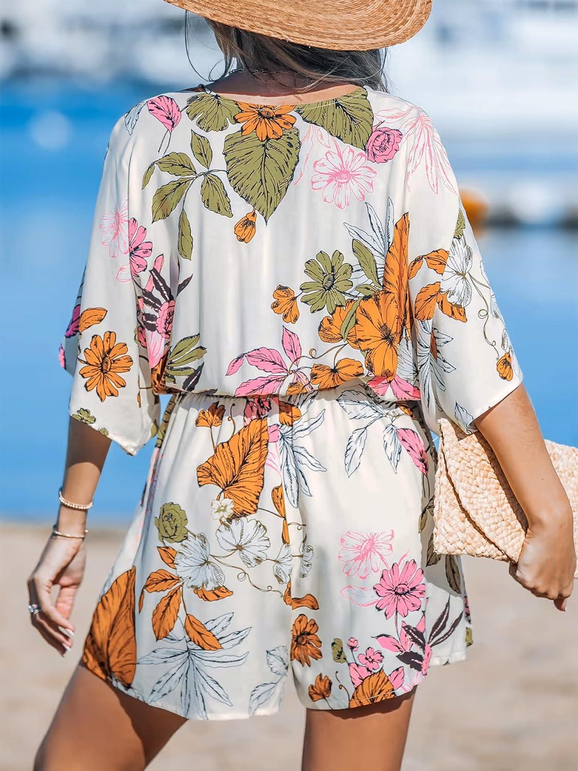 CUPSHE Women’s Summer Romper Lace Up Printed Half Sleeves Casual Wide leg Vacation Outfit Mini One Piece Jumpsuit(White Printed)