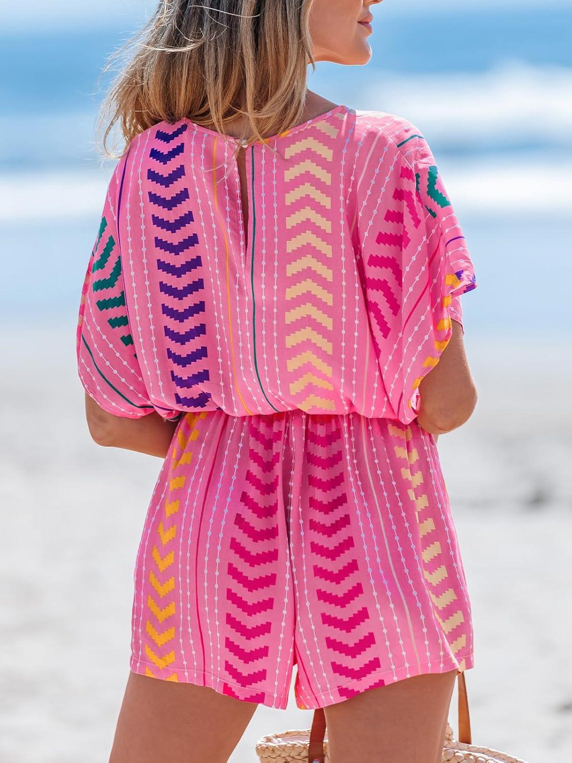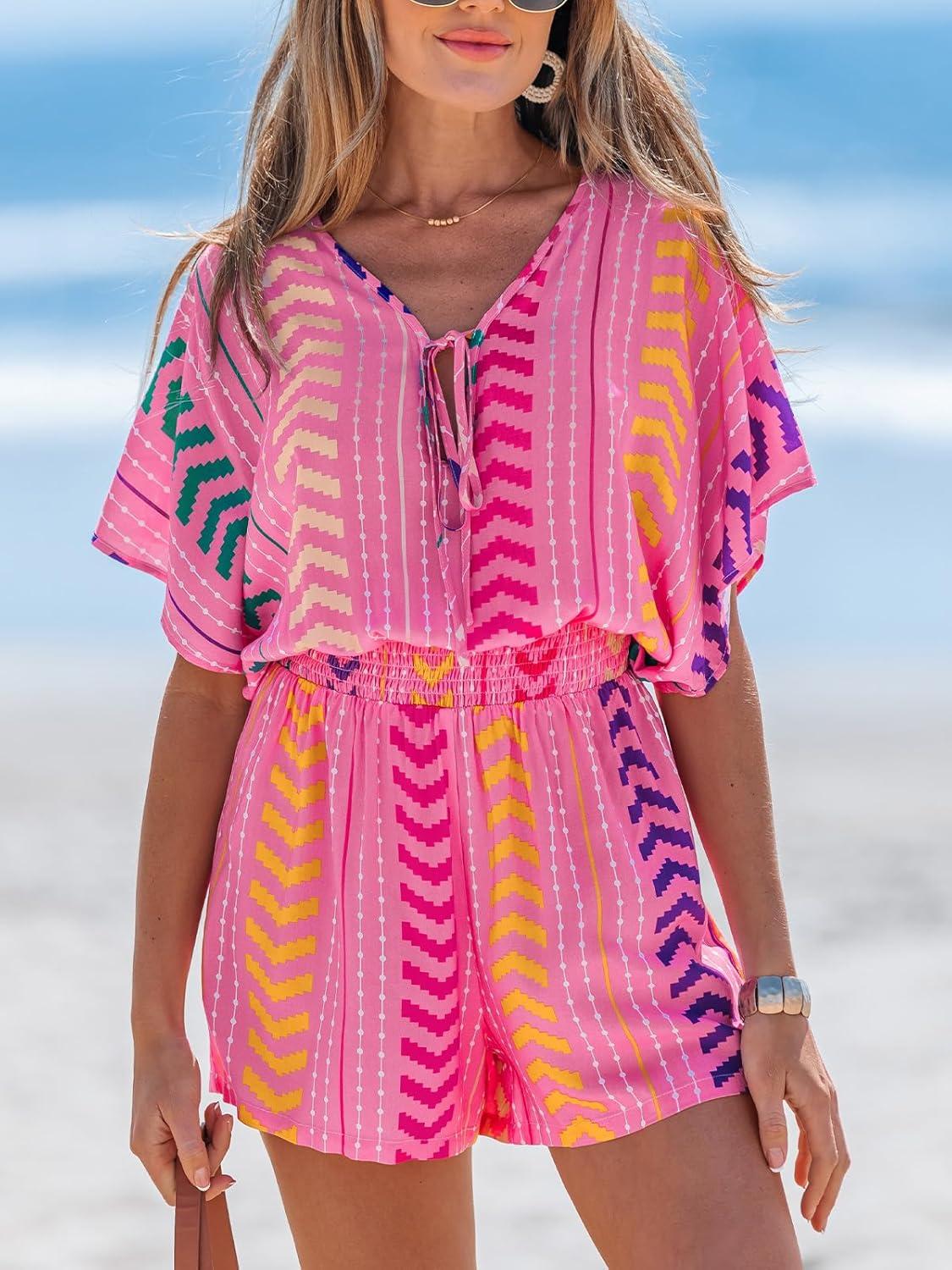 CUPSHE Women’s Summer Romper V Neck Short Sleeve Tie Front Jumpsuits Wide Leg Elastic Waist Hobo Overalls Beach Outfits(Pink)