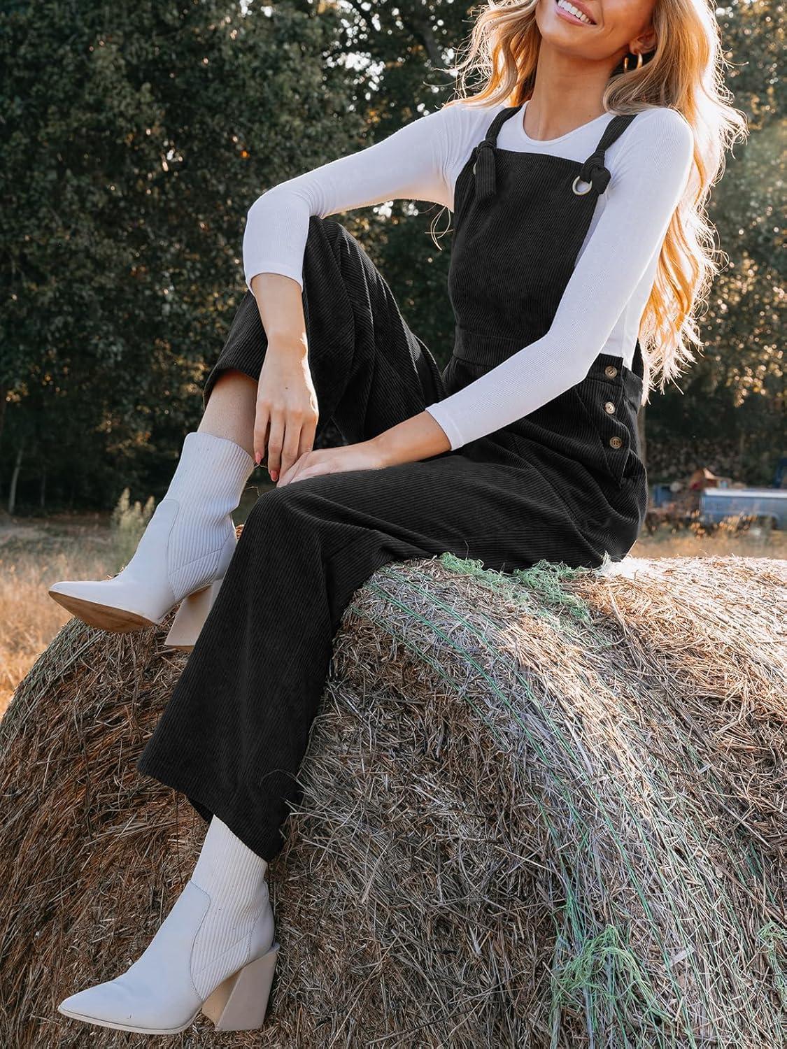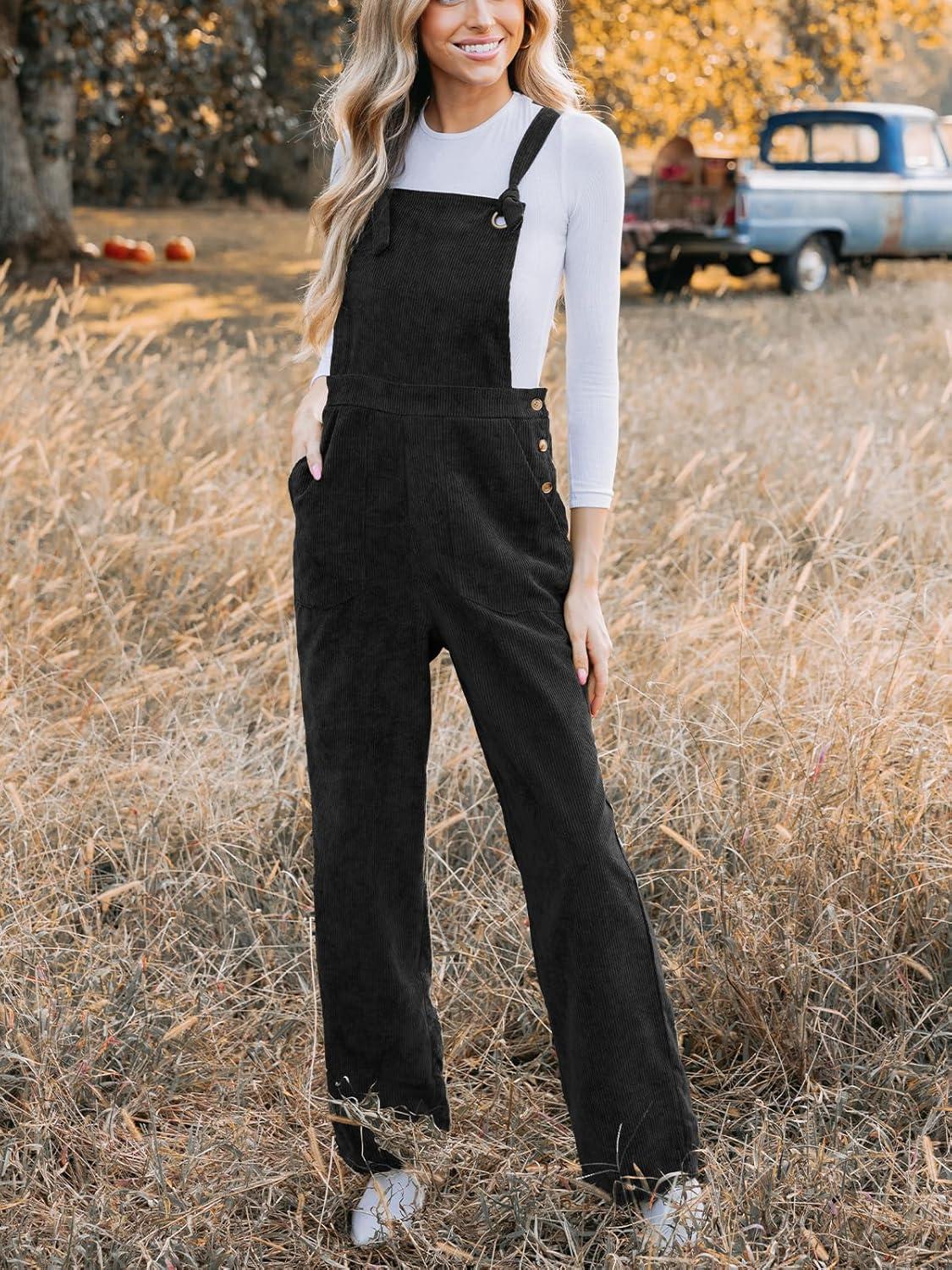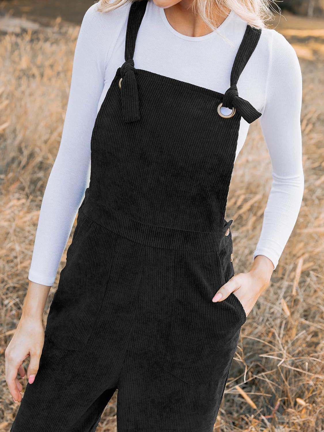 CUPSHE Women’s Corduroy Fall Overall Jumpsuits Self Tie Strap Slanted Front Pockets Side Buttons Wide Leg Casual Rompers(Black)