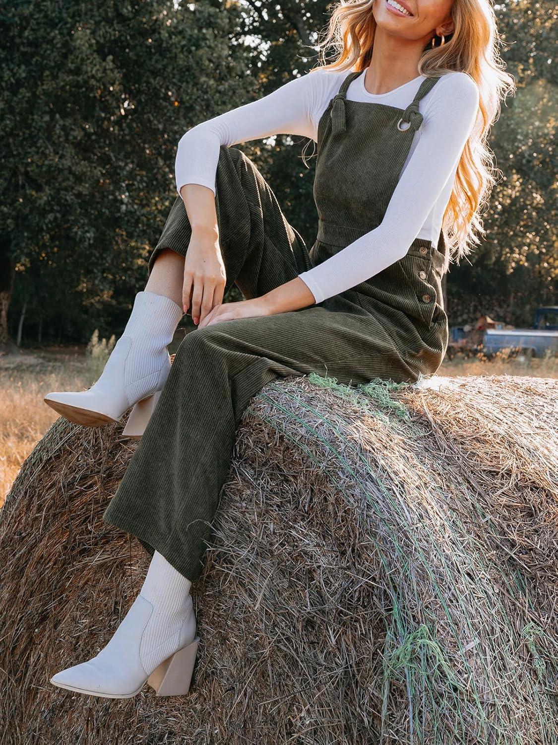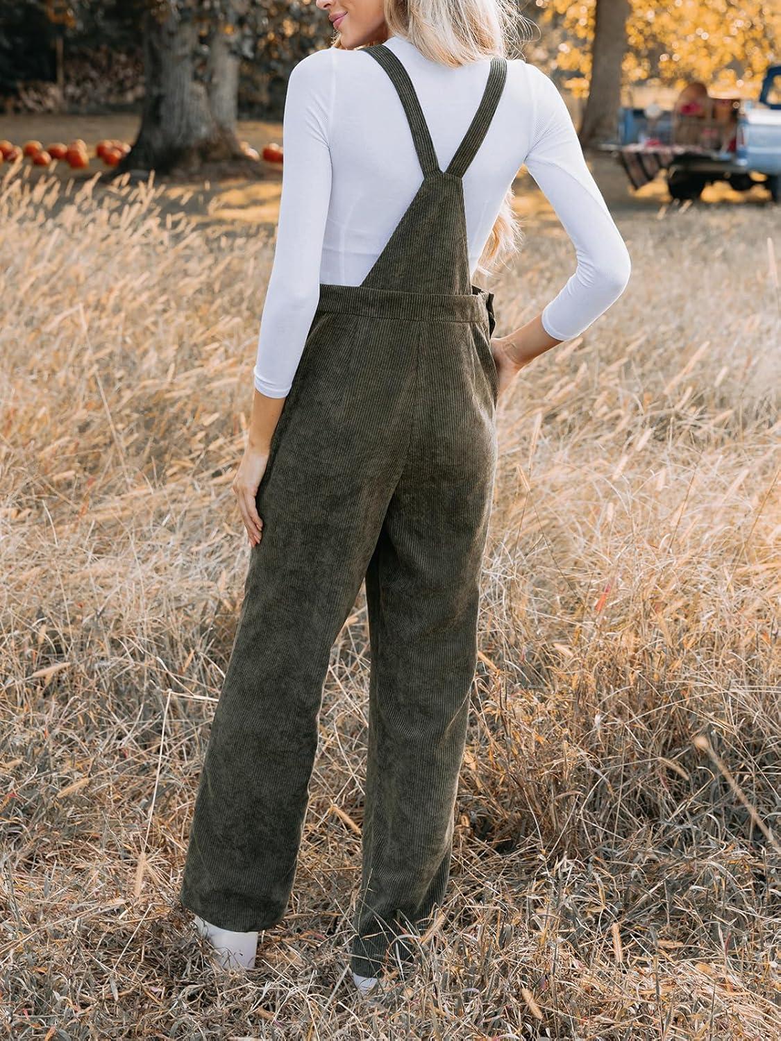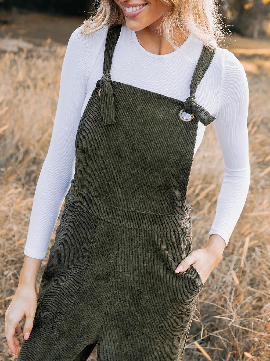 CUPSHE Women’s Corduroy Fall Overall Jumpsuits Self Tie Strap Slanted Front Pockets Side Buttons Wide Leg Casual Rompers(Olive)