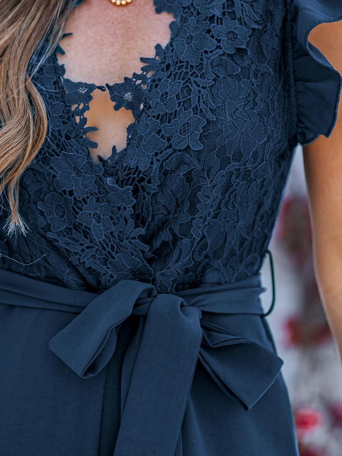 CUPSHE Women’s Dressy Lace Maxi Jumpsuit Date Night Sleeveless Rompers V Neck Belt Pockets Overall Outfits(Navy Blue)
