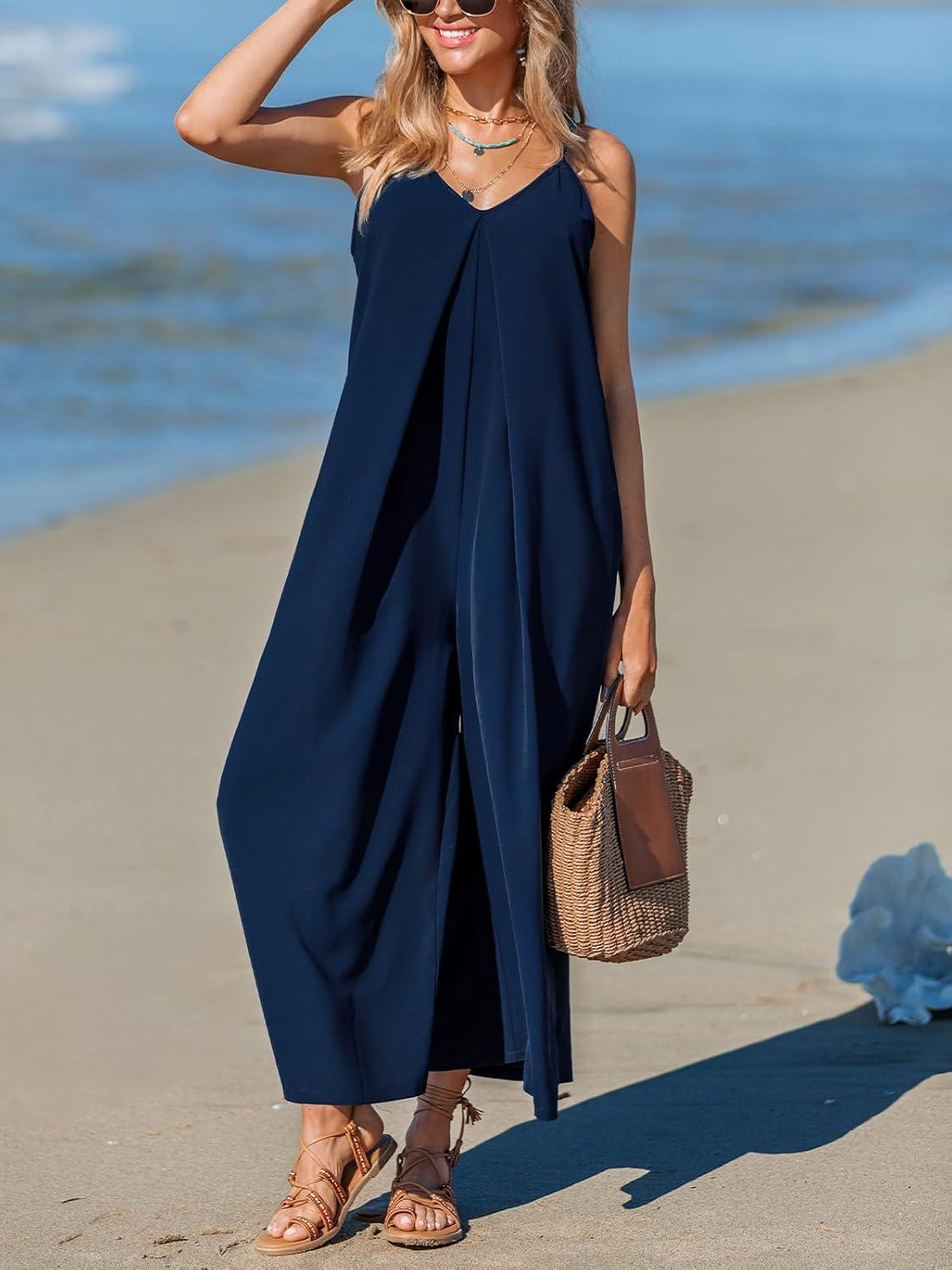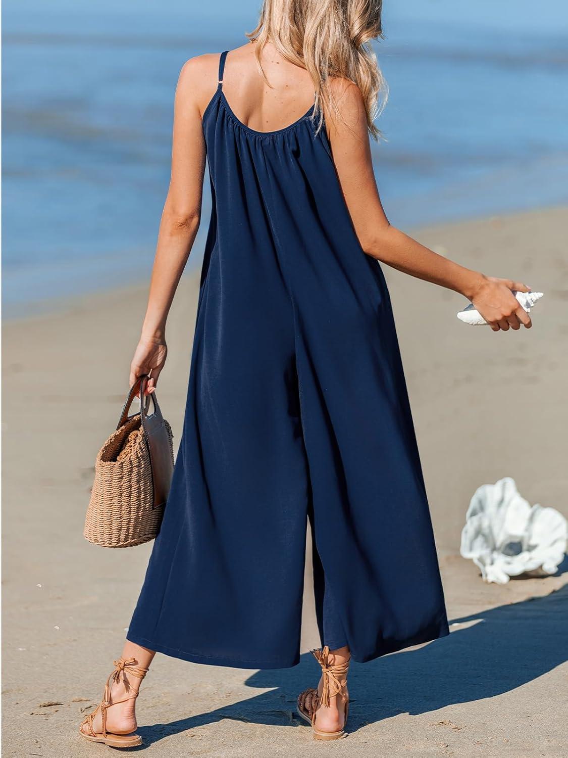 CUPSHE Women’s Jumpsuit Spaghetti Strap V Neck Loose Wide Leg Pants High Waist Casual Summer Sleeveless Romper(Navy)