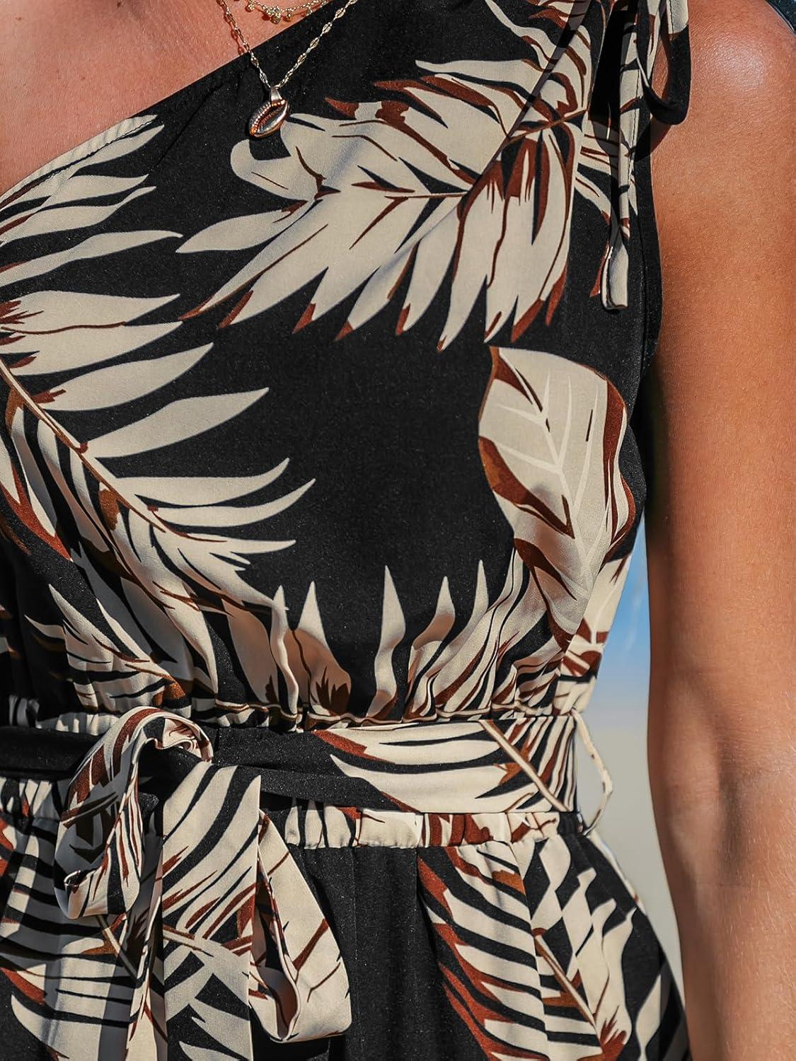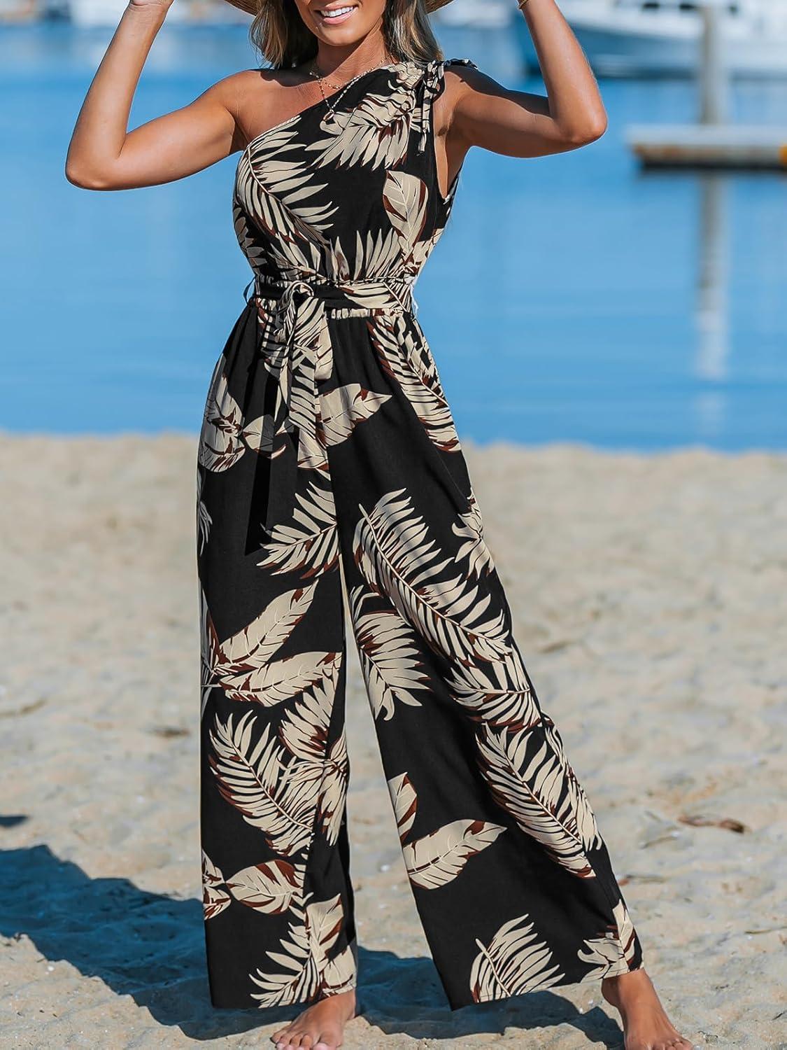 CUPSHE Women’s Jumpsuits Sleeveless Floral One Shoulder Wide Leg Long Pants 2025 Trendy Travel Outfit Pocket(Black)
