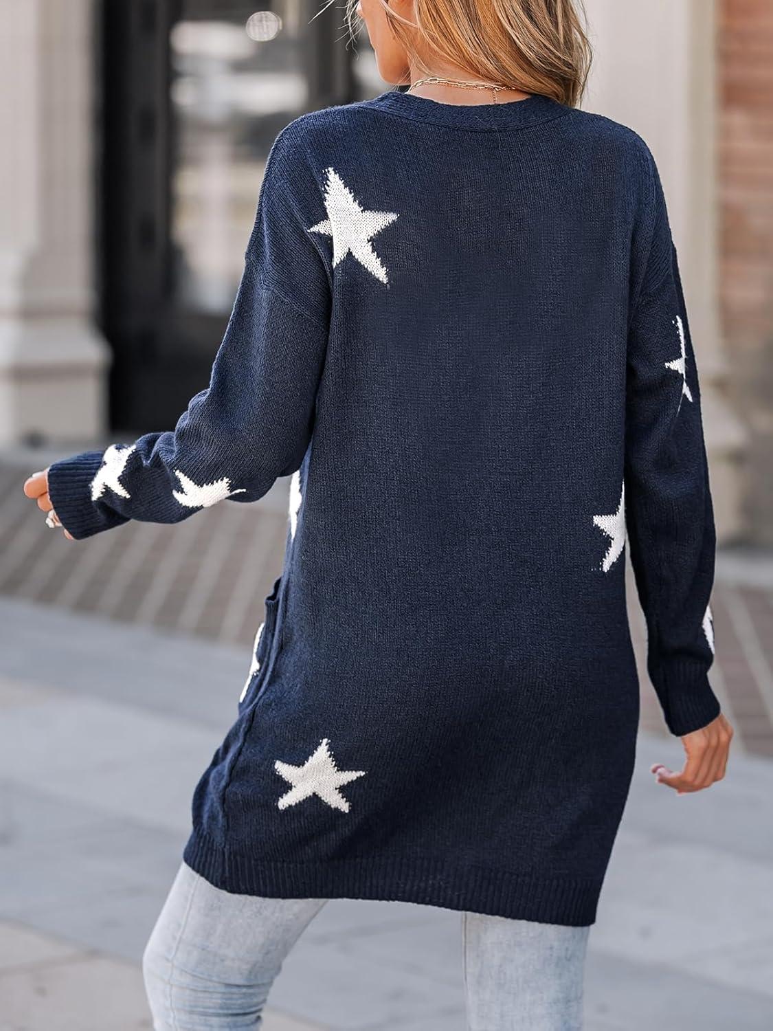 CUPSHE Womens Long Sleeve Cardigan Sweater Knit Button Down Open Front Sweater Coat Star Print Outwear with Pockets(Navy)