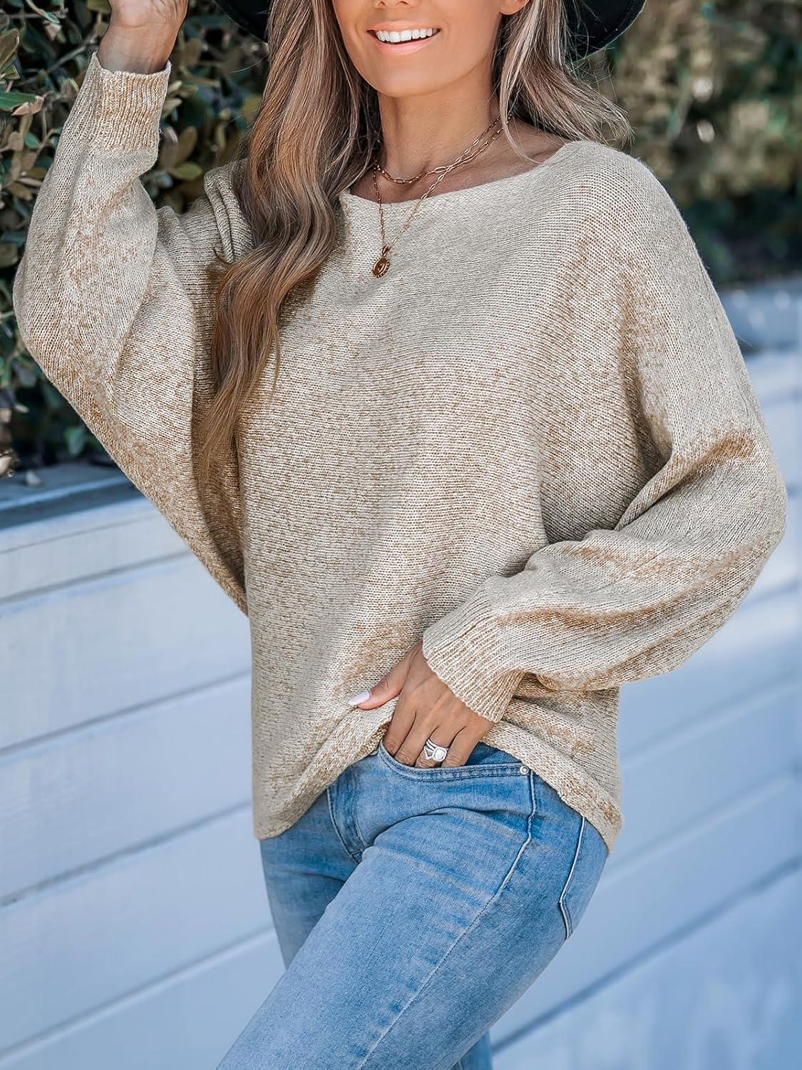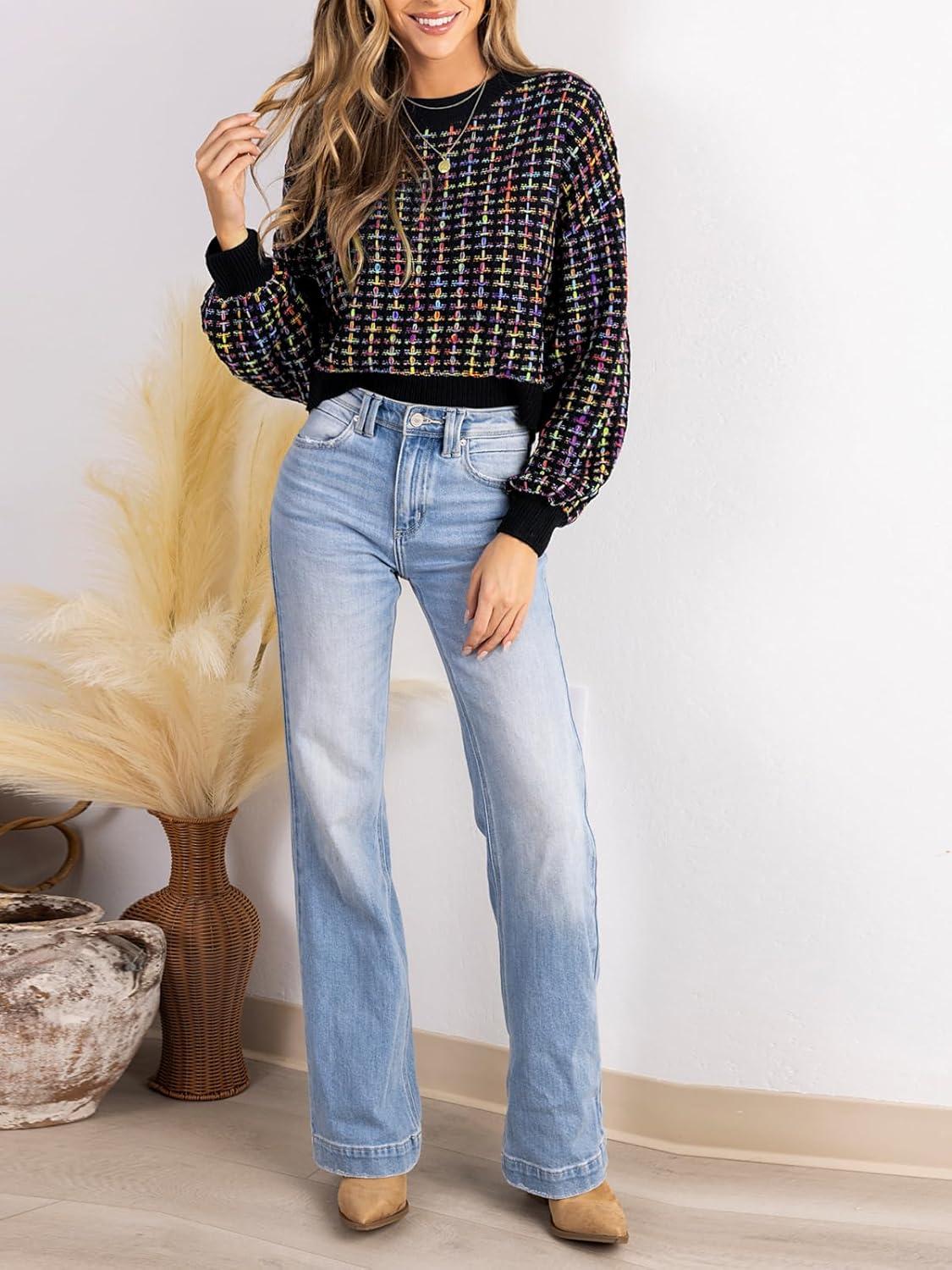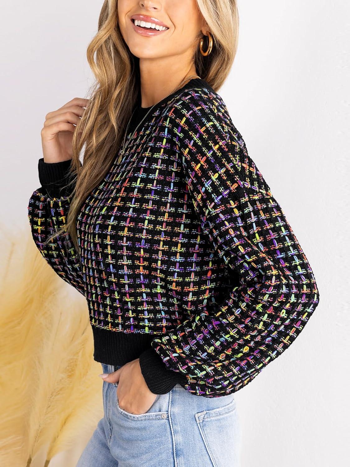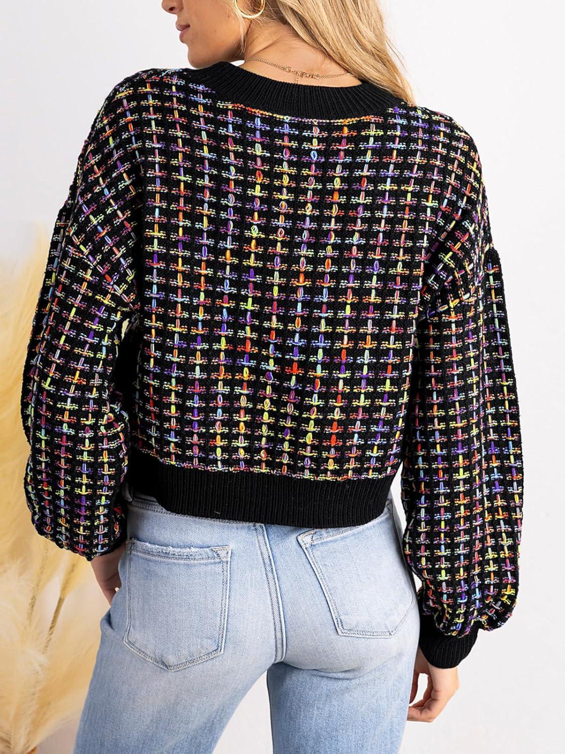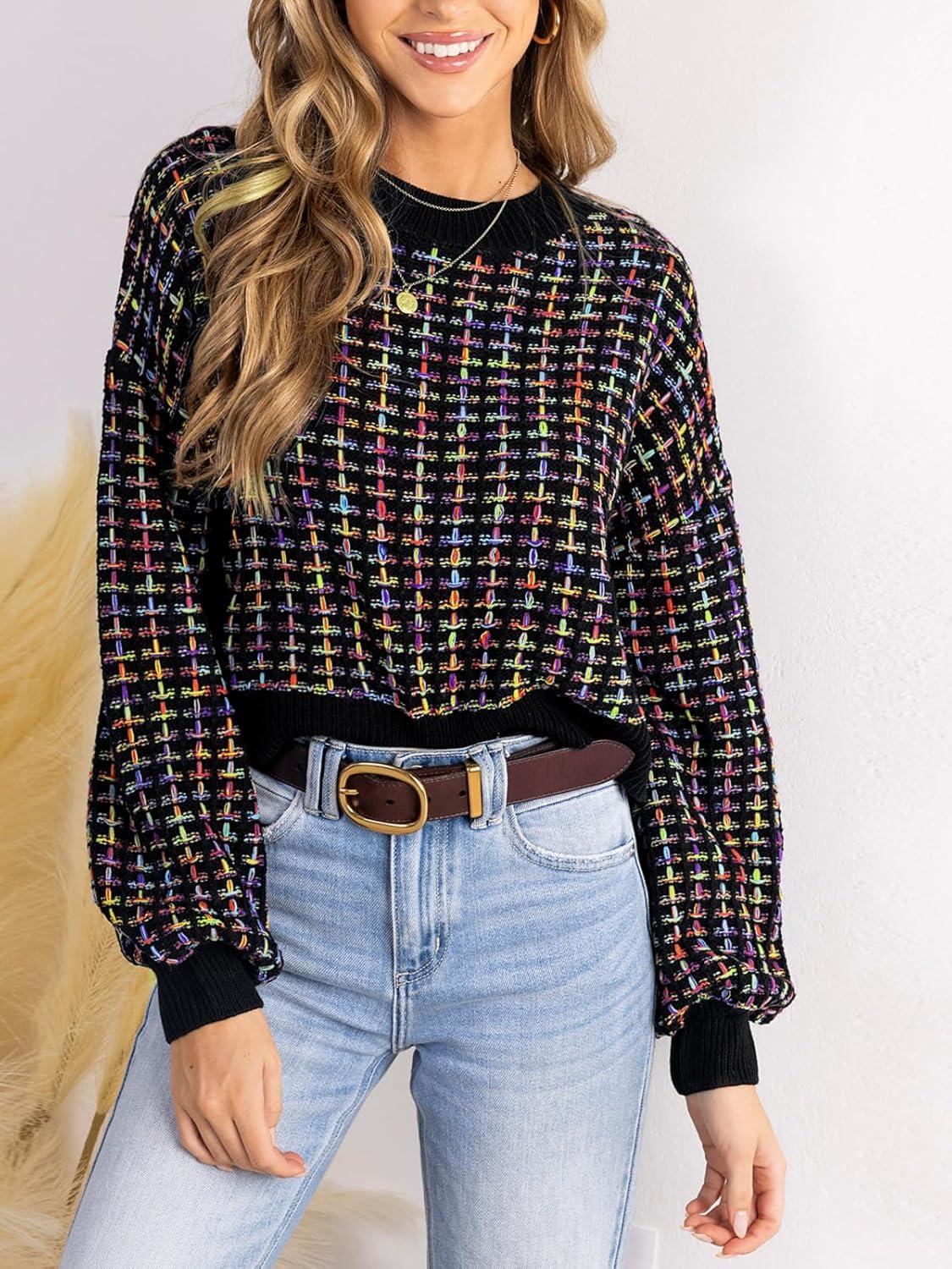CUPSHE Womens Long Sleeve Knit Sweater Color Block Puff Drop Sleeve Round Neck Pullover Sweater Tops(Muiticolored)