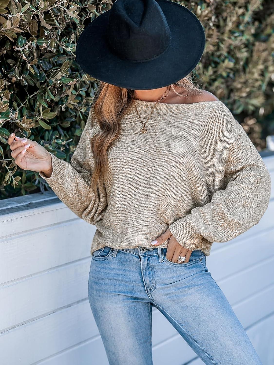 CUPSHE Womens Off The Shoulder Sweaters Long Sleeve Lightweight Knit Casual Pullover Sweater Tops(Khaki)
