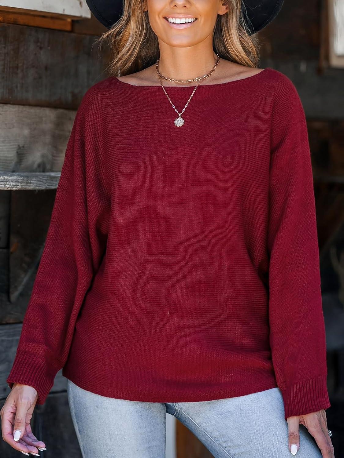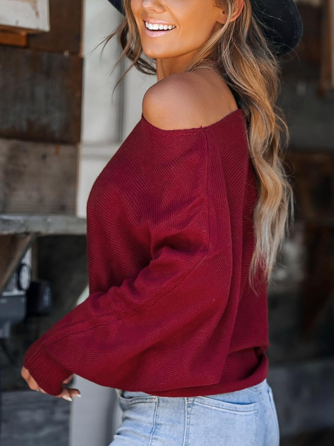 CUPSHE Womens Off The Shoulder Sweaters Long Sleeve Lightweight Knit Casual Pullover Sweater Tops(Red)