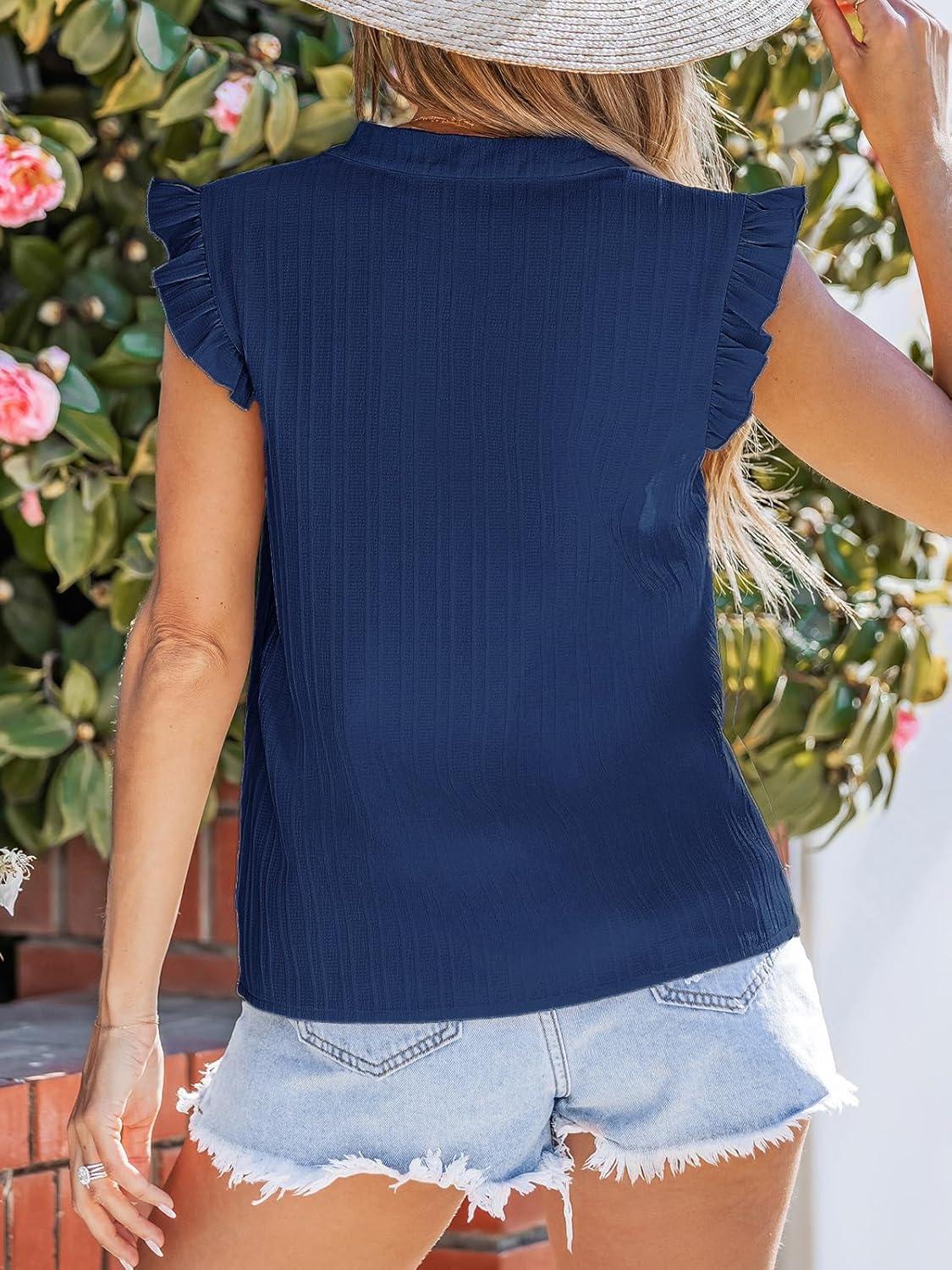 CUPSHE Womens Top Woven V Neck Sleeveless Smocked Cuffs Blouse Casual Loose(Navy)