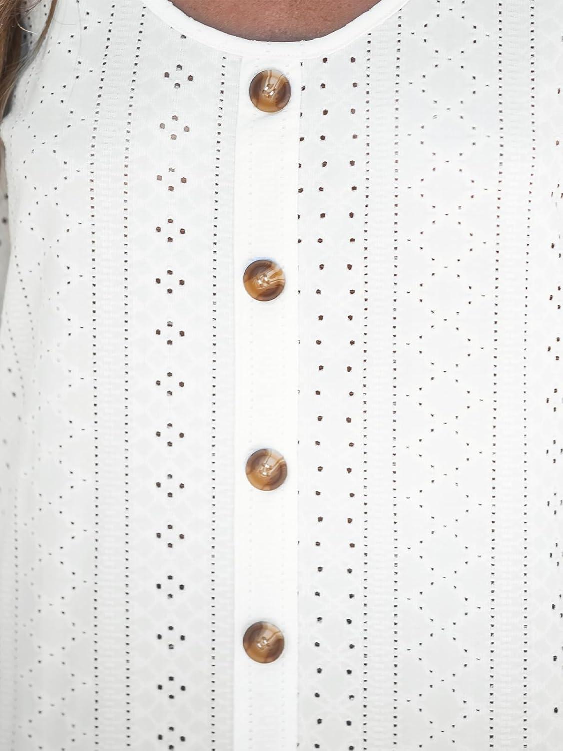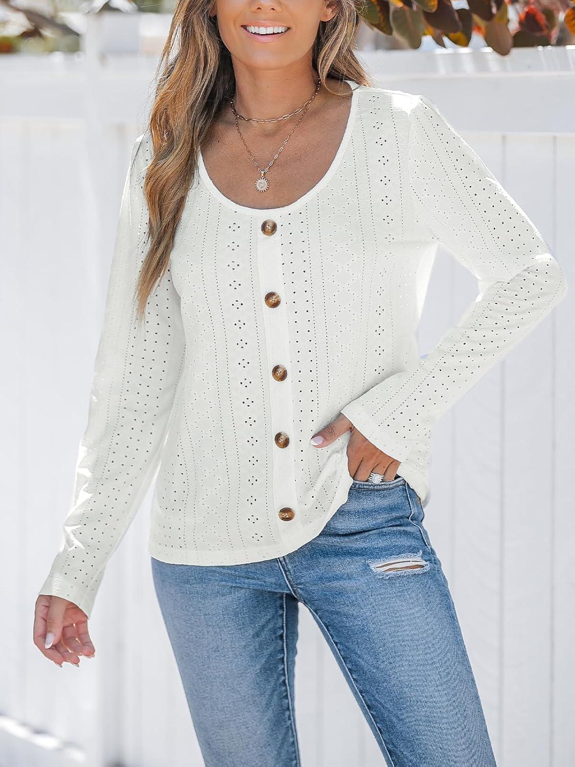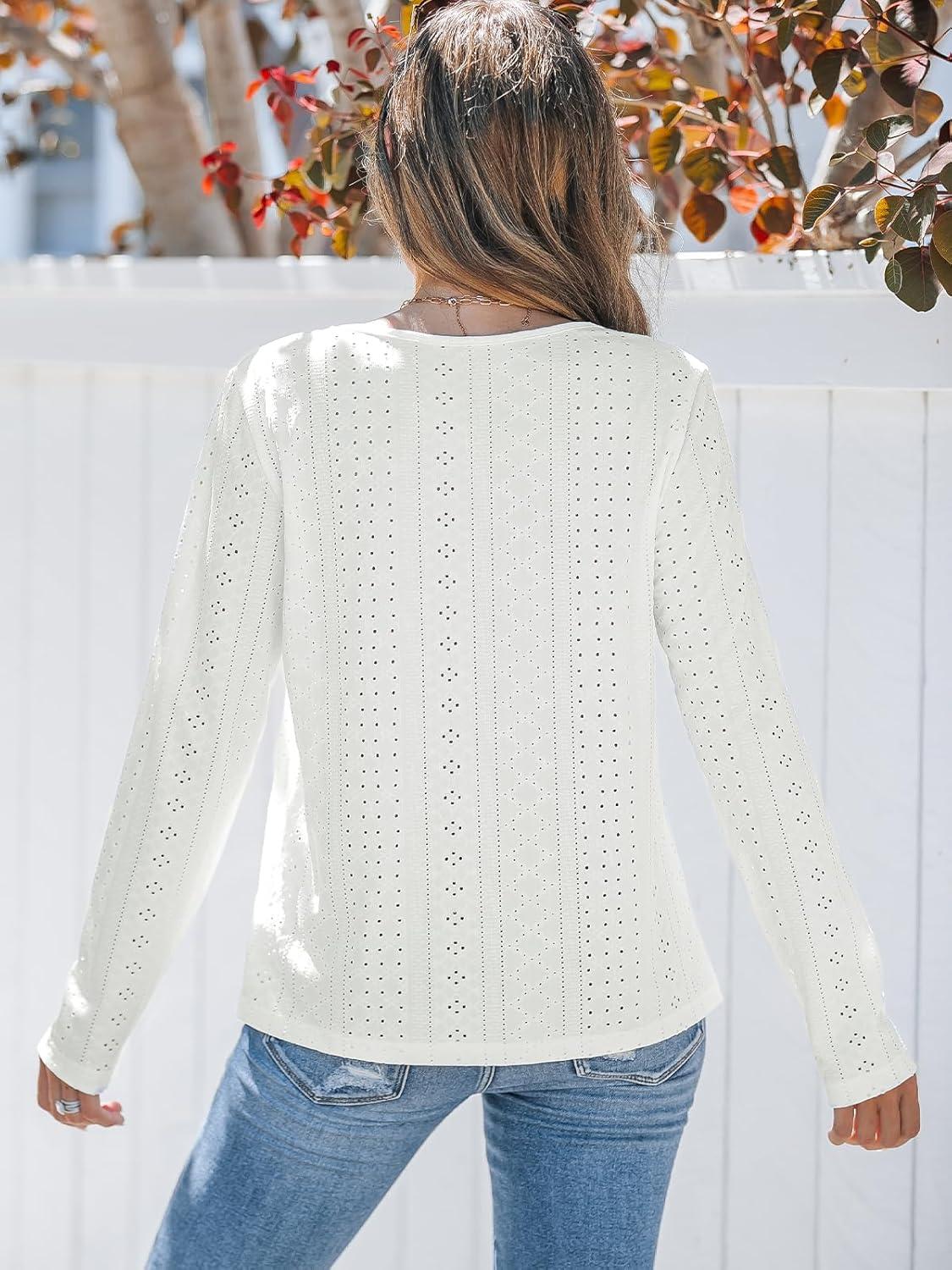 CUPSHE Womens Tops Eyelet Long Sleeve Blouse V-Neck Shirts Dressy Casual Blouses for Women White