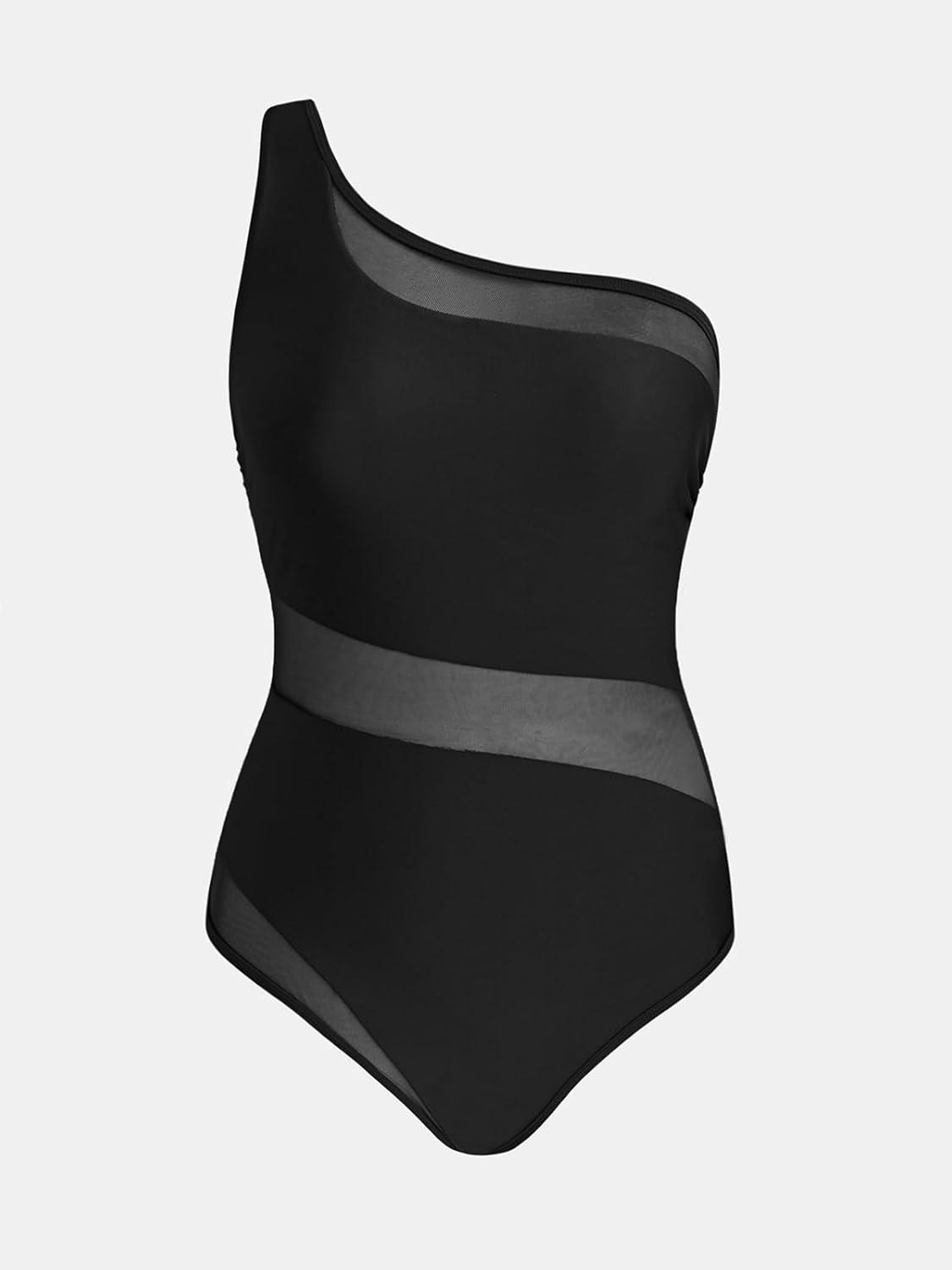 CUPSHE Women’s One Piece Swimsuit One Shoulder Asymmetrical Neck Open Panel Bathing Suit Mesh Panel(Black)