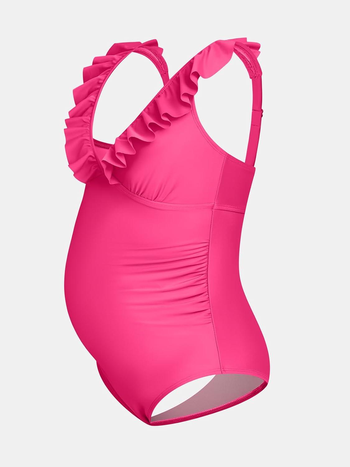 CUPSHE Women Swimsuit Maternity One Piece Bathing Suit Deep V Neck Ruffle Back Tie Ruching Adjustable Straps Swimwear(Bright Pink)