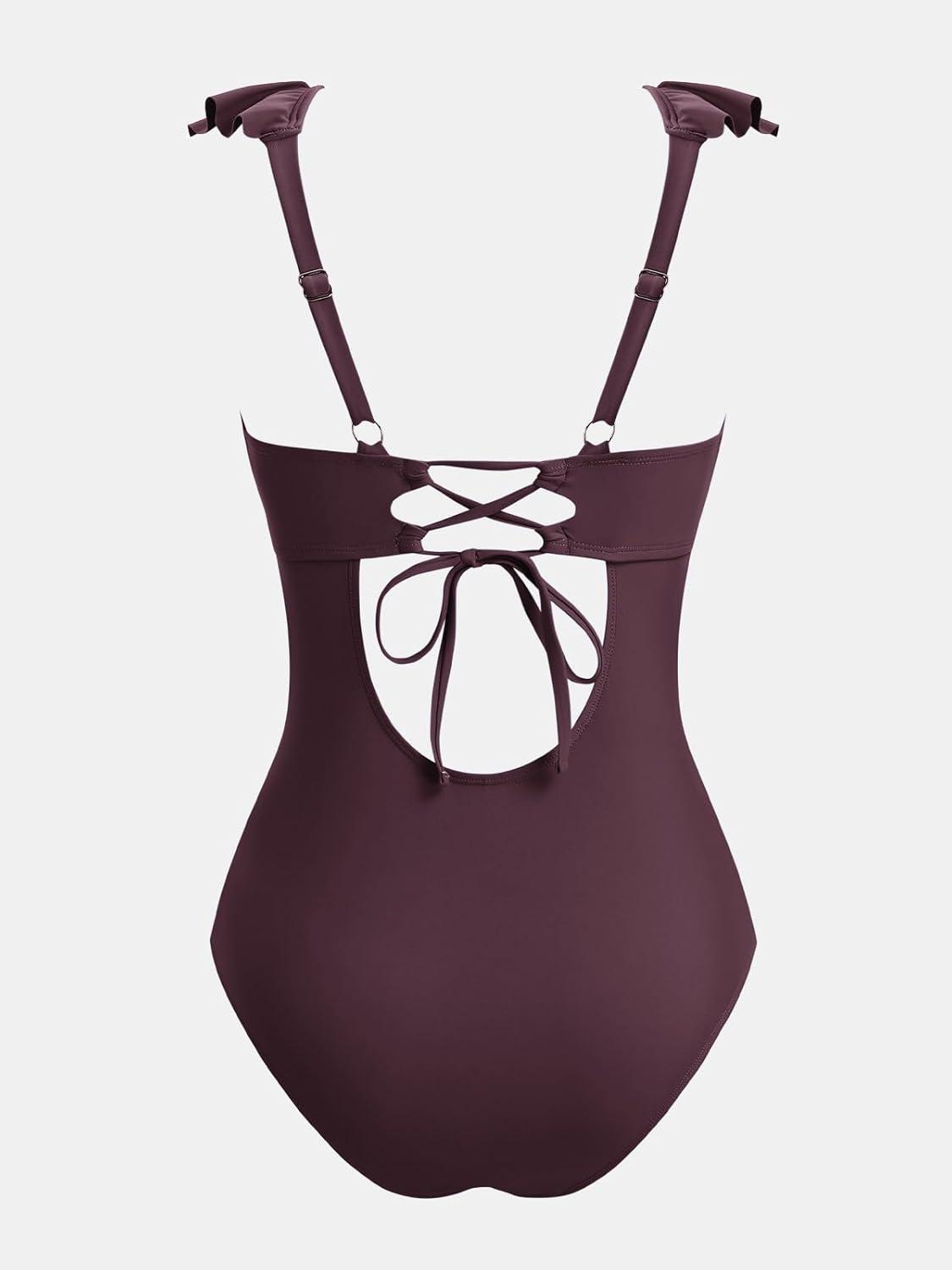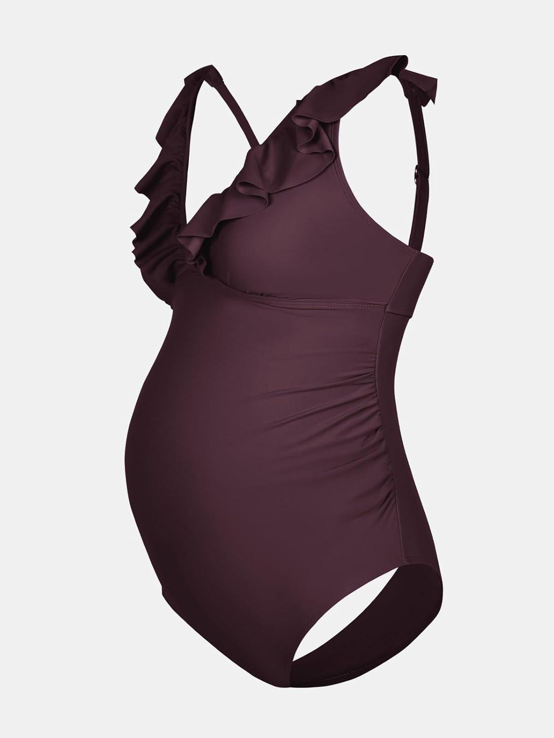CUPSHE Women Swimsuit Maternity One Piece Bathing Suit Deep V Neck Ruffle Back Tie Ruching Adjustable Straps Swimwear(Brown)