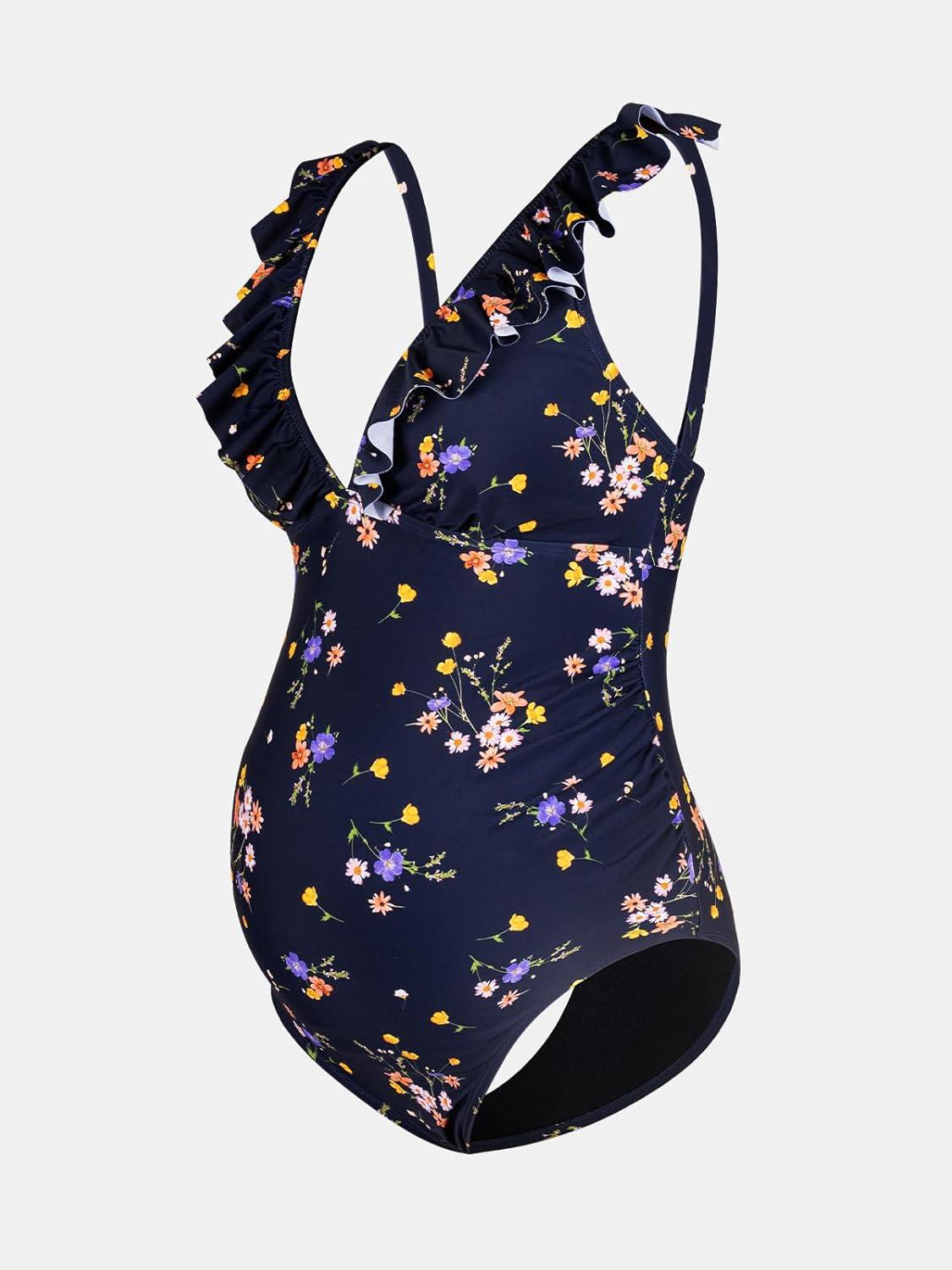 CUPSHE Women Swimsuit Maternity One Piece Bathing Suit Deep V Neck Ruffle Back Tie Ruching Adjustable Straps Swimwear(Dark Blue/Floral)