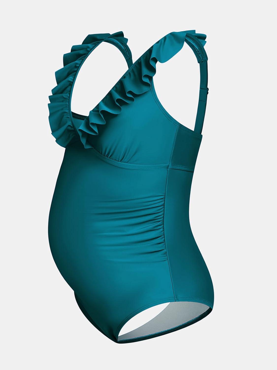 CUPSHE Women Swimsuit Maternity One Piece Bathing Suit Deep V Neck Ruffle Back Tie Ruching Adjustable Straps Swimwear(Teal Blue)