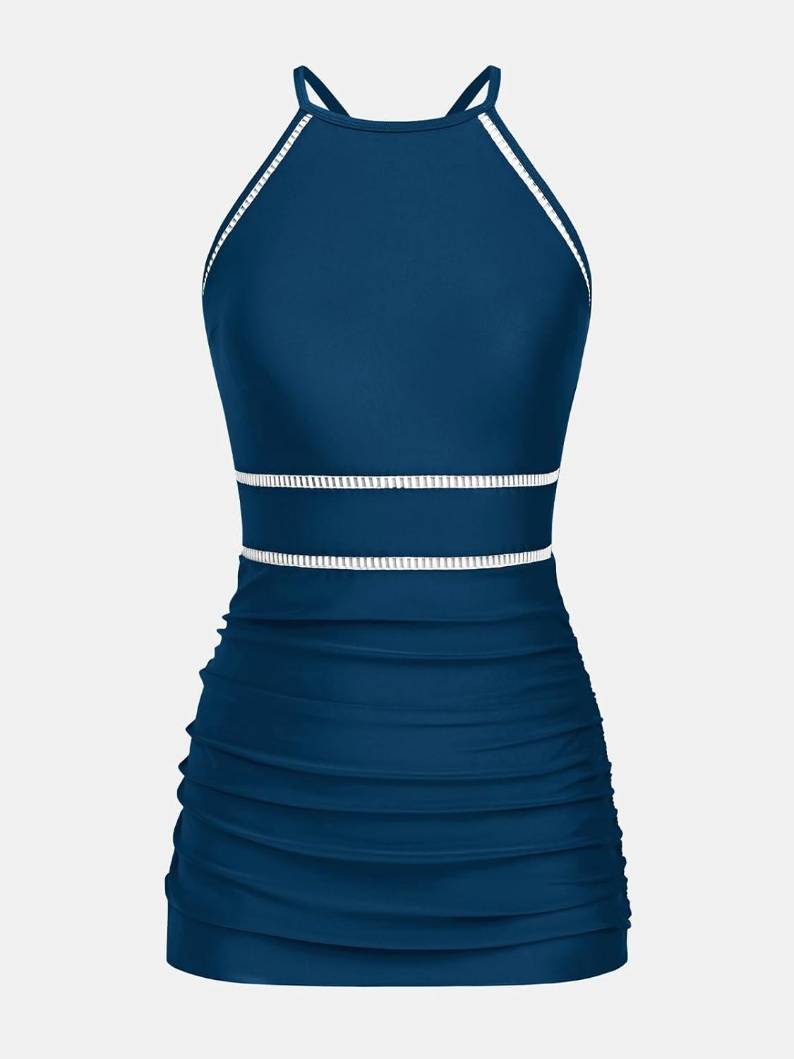 CUPSHE Women’s One Piece Swim Dress Tummy Control Swimsuit Ruching Skirt High Neck Adjustable Straps Bathing Suit(Navy Blue)