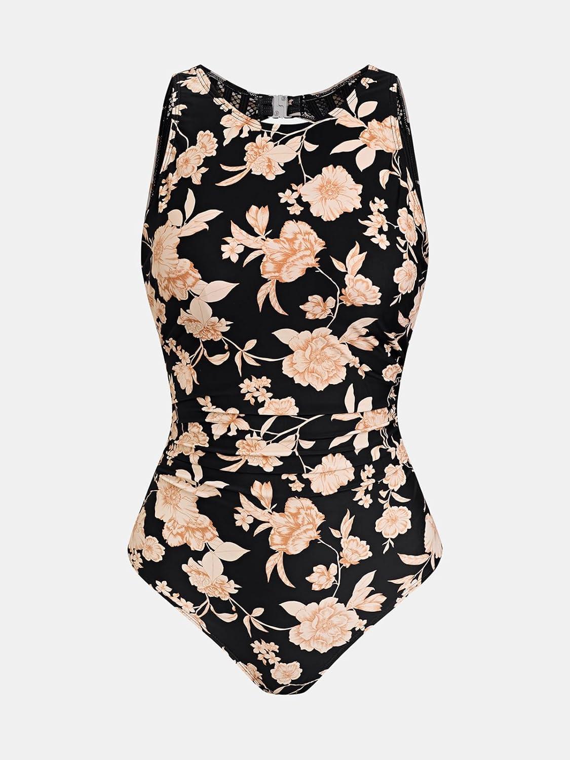 CUPSHE Women’s One Piece Swimsuit Bathing Suit Tummy Control High Neck Cutout Back Hook Mesh Swimwear(Black/Beige Floral)