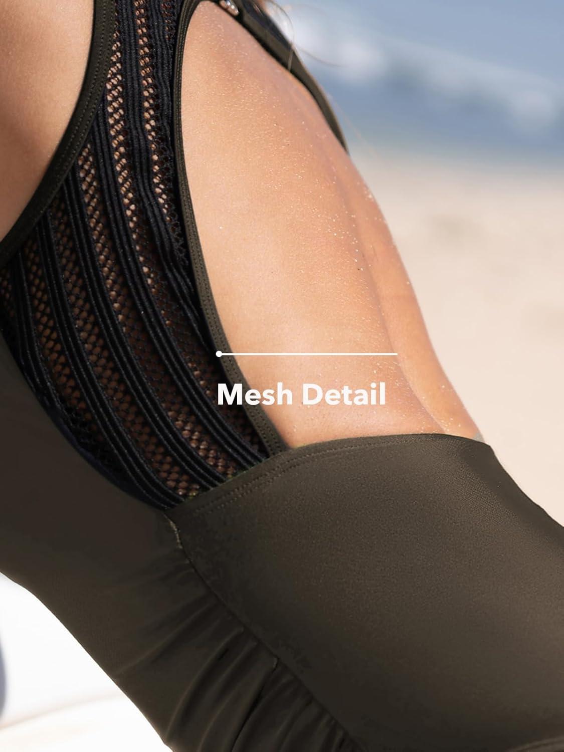 CUPSHE Women’s One Piece Swimsuit Bathing Suit Tummy Control High Neck Cutout Back Hook Mesh Swimwear(Dark Green)