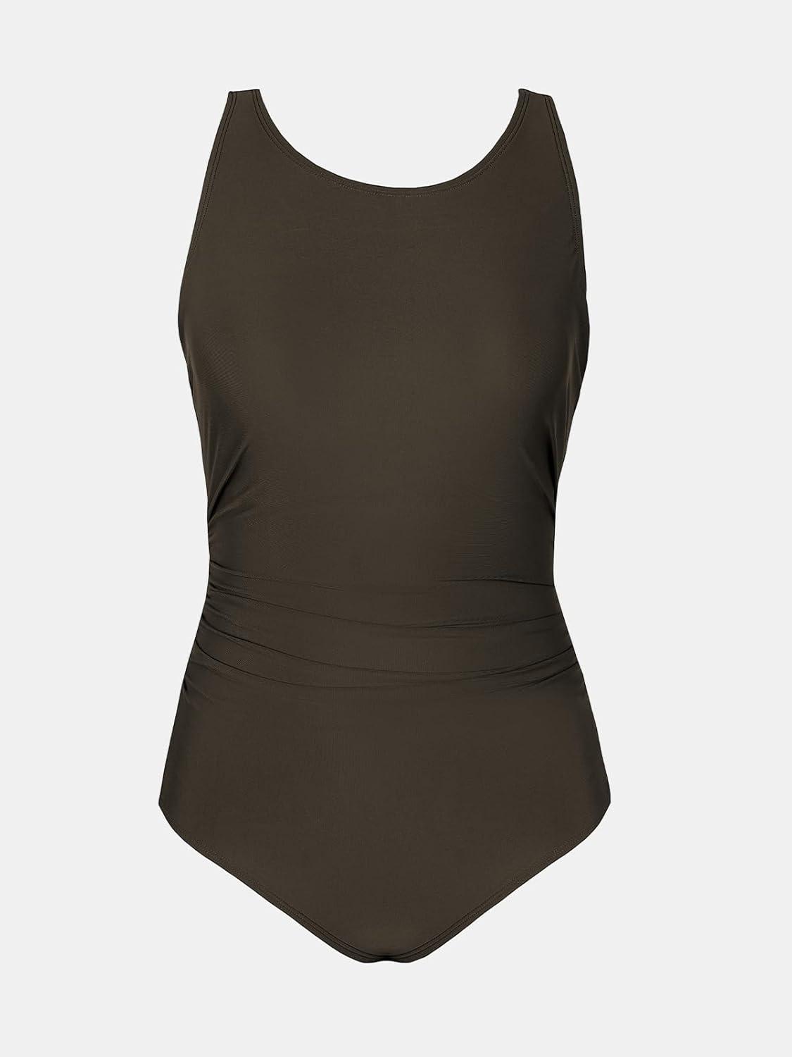 CUPSHE Women’s One Piece Swimsuit Bathing Suit Tummy Control High Neck Cutout Back Hook Mesh Swimwear(Coffee Brown)