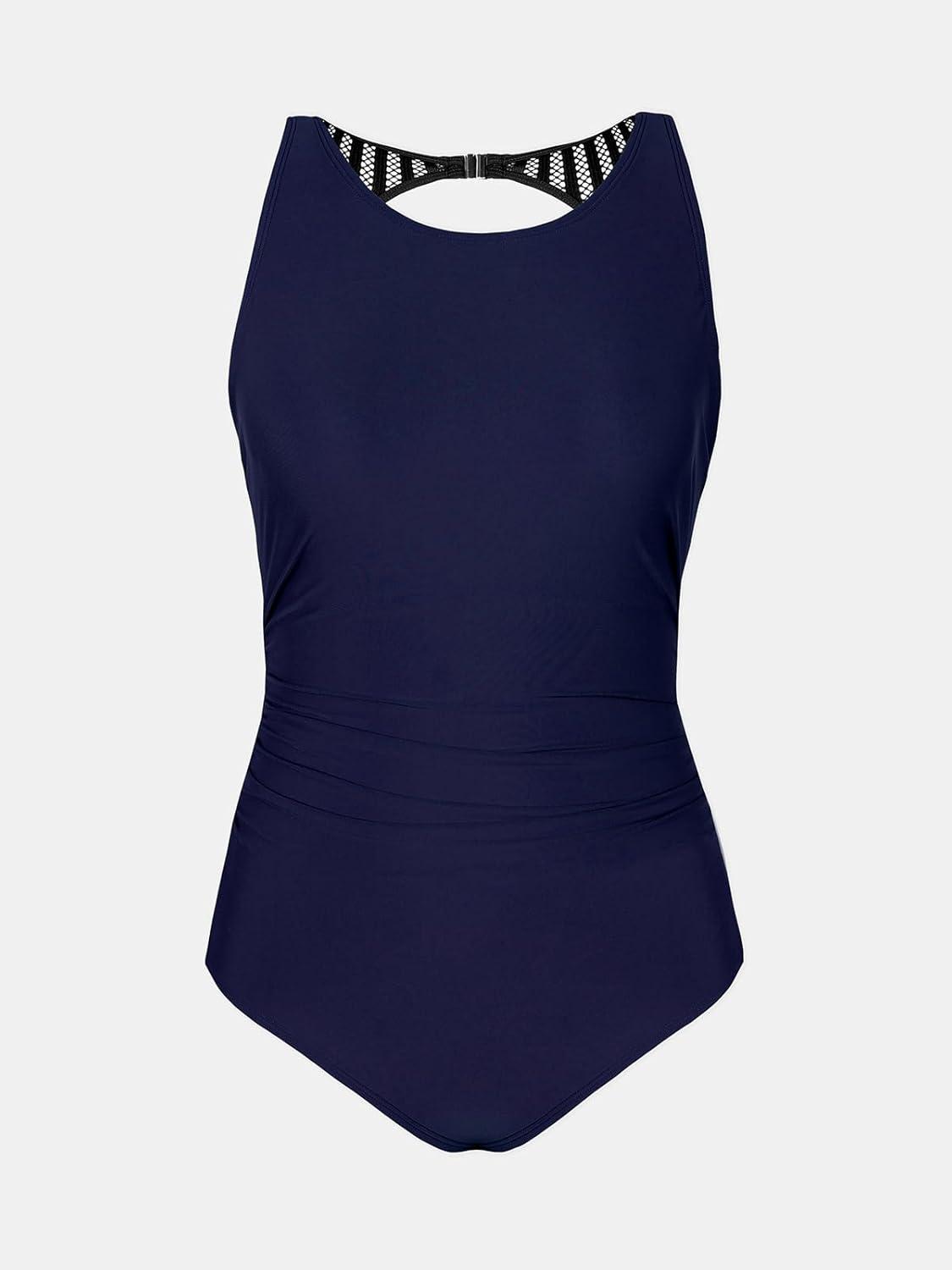 CUPSHE Women’s One Piece Swimsuit Bathing Suit Tummy Control High Neck Cutout Back Hook Mesh Swimwear(Navy Blue)