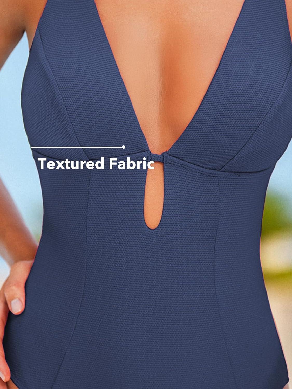 CUPSHE Women’s One Piece Swimsuit Deep V Neck Keyhole Cutout O Ring Textured Bathing Suit(Navy Blue)