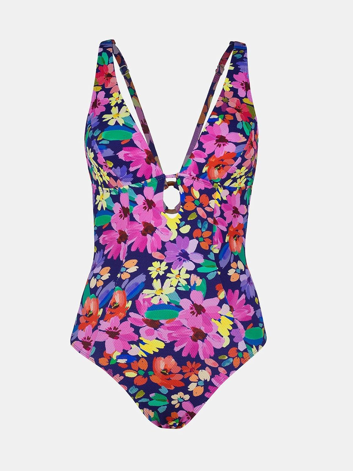 CUPSHE Women’s One Piece Swimsuit Deep V Neck Keyhole Cutout O Ring Textured Bathing Suit(Navy Blue/Floral)