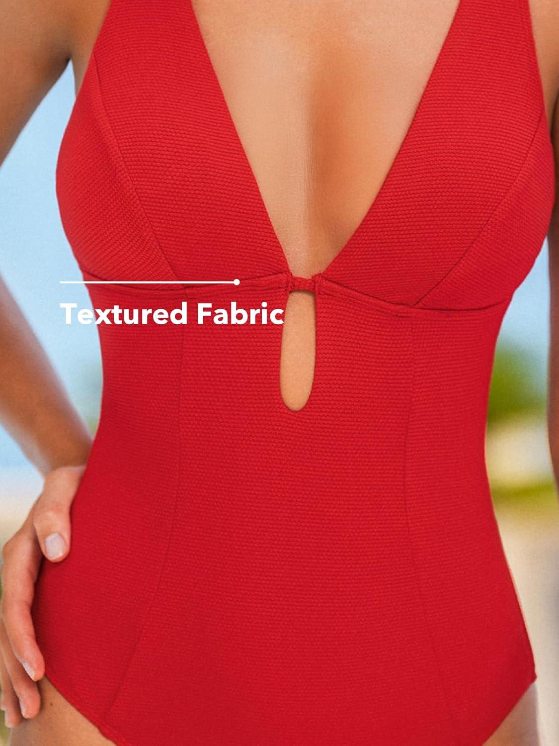 CUPSHE Women’s One Piece Swimsuit Deep V Neck Keyhole Cutout O Ring Textured Bathing Suit(Red)