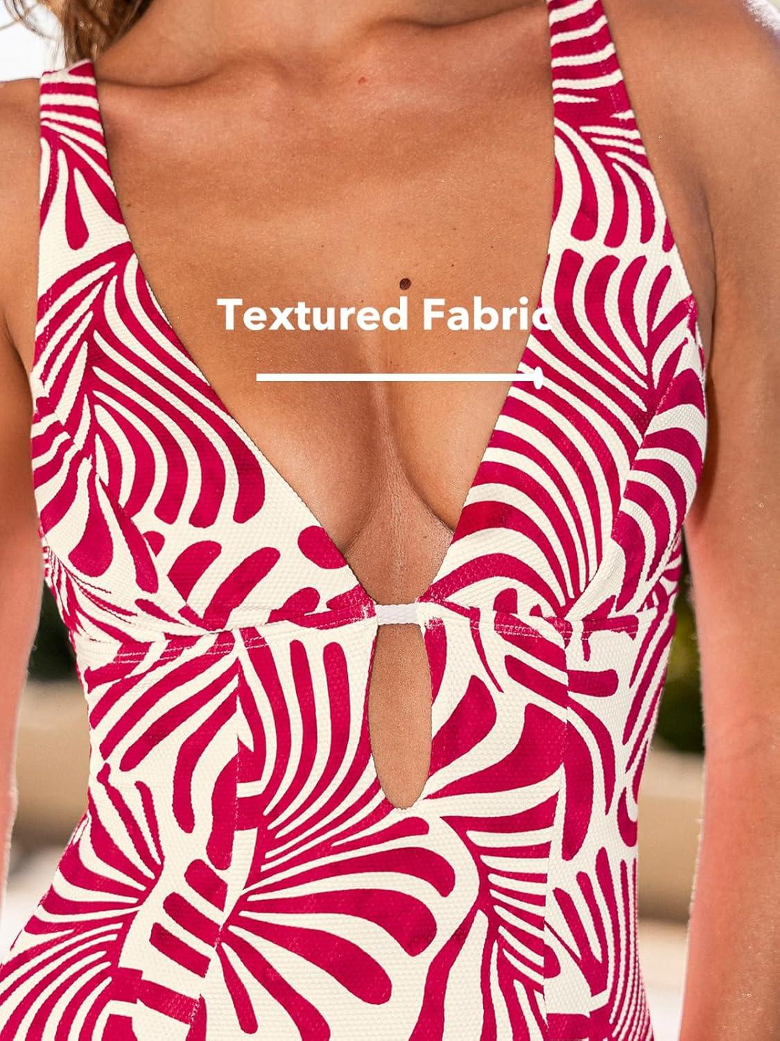 CUPSHE Women’s One Piece Swimsuit Deep V Neck Keyhole Cutout O Ring Textured Bathing Suit(Red Abstract Leaf)