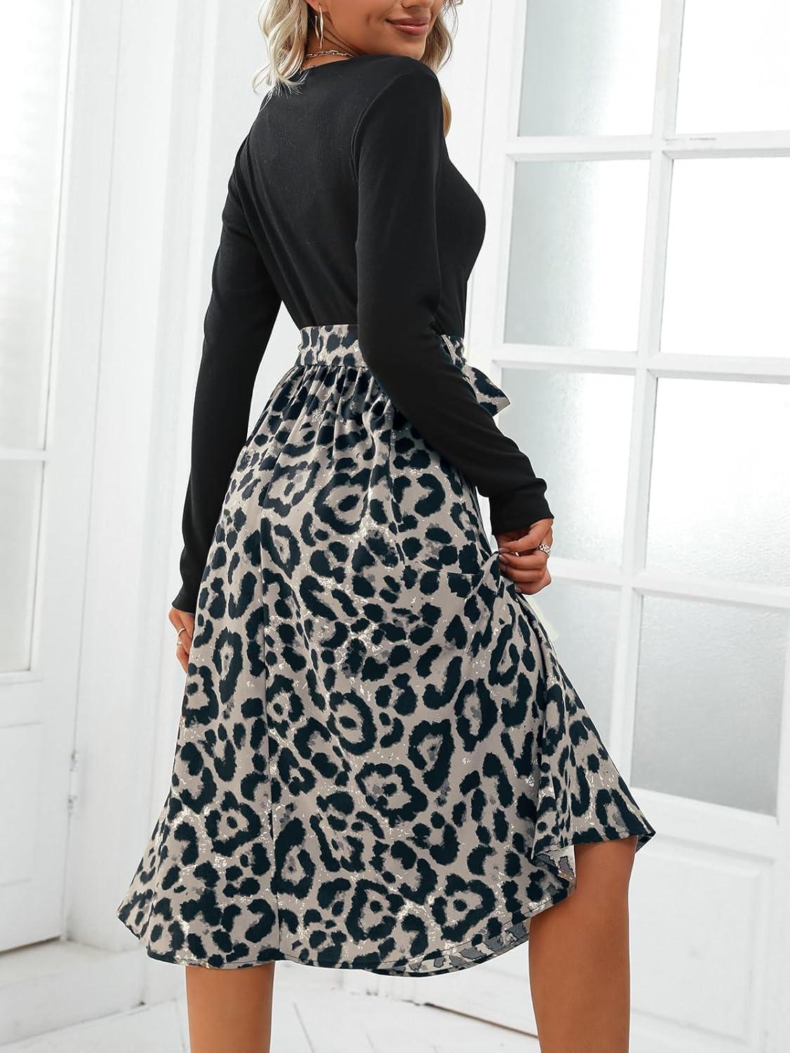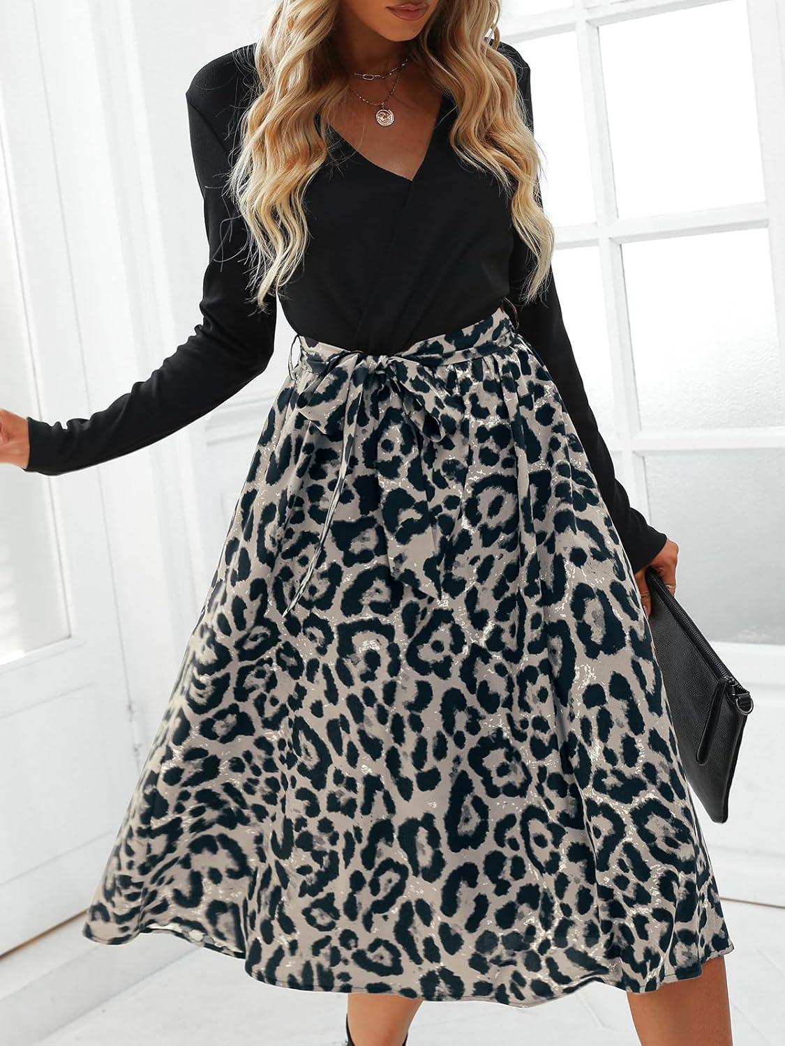 CUPSHE Womens Leopard Print Panel A Line Midi Dress Long Sleeve V Neck Waist Tie Wrap Casual Fall Dresses(Multicoloured)