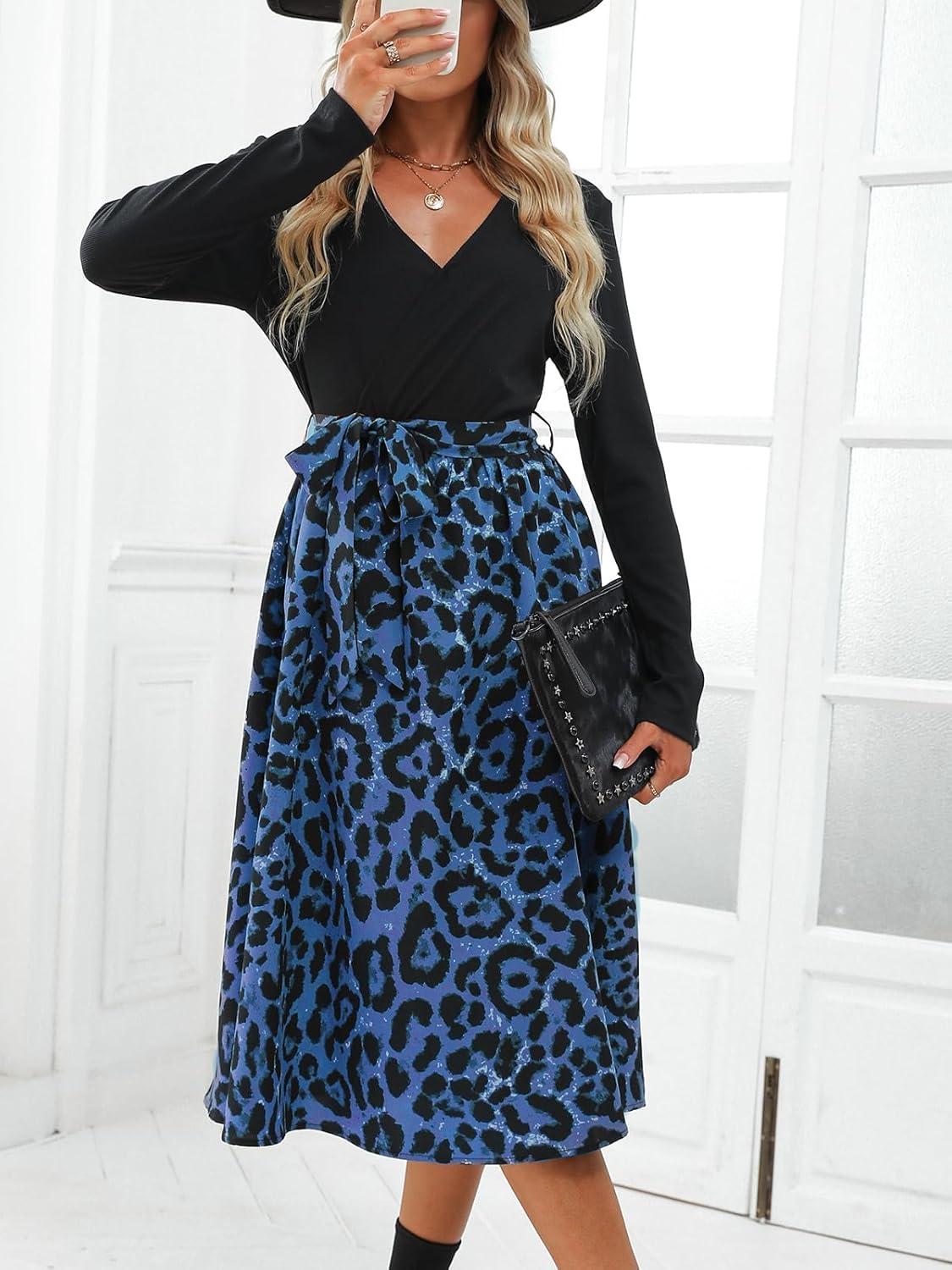 CUPSHE Womens Leopard Print Panel A Line Midi Dress Long Sleeve V Neck Waist Tie Wrap Casual Fall Dresses(Blue Leopard)