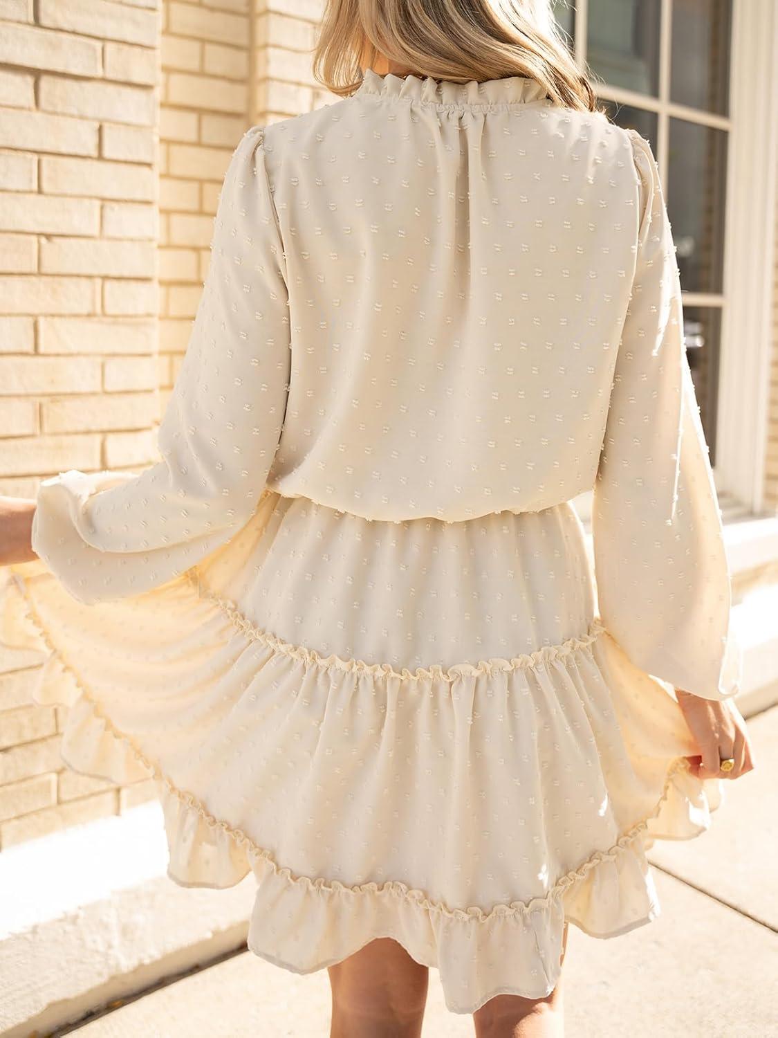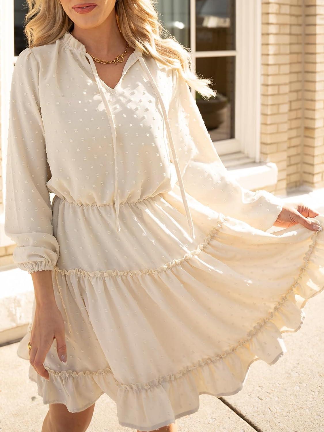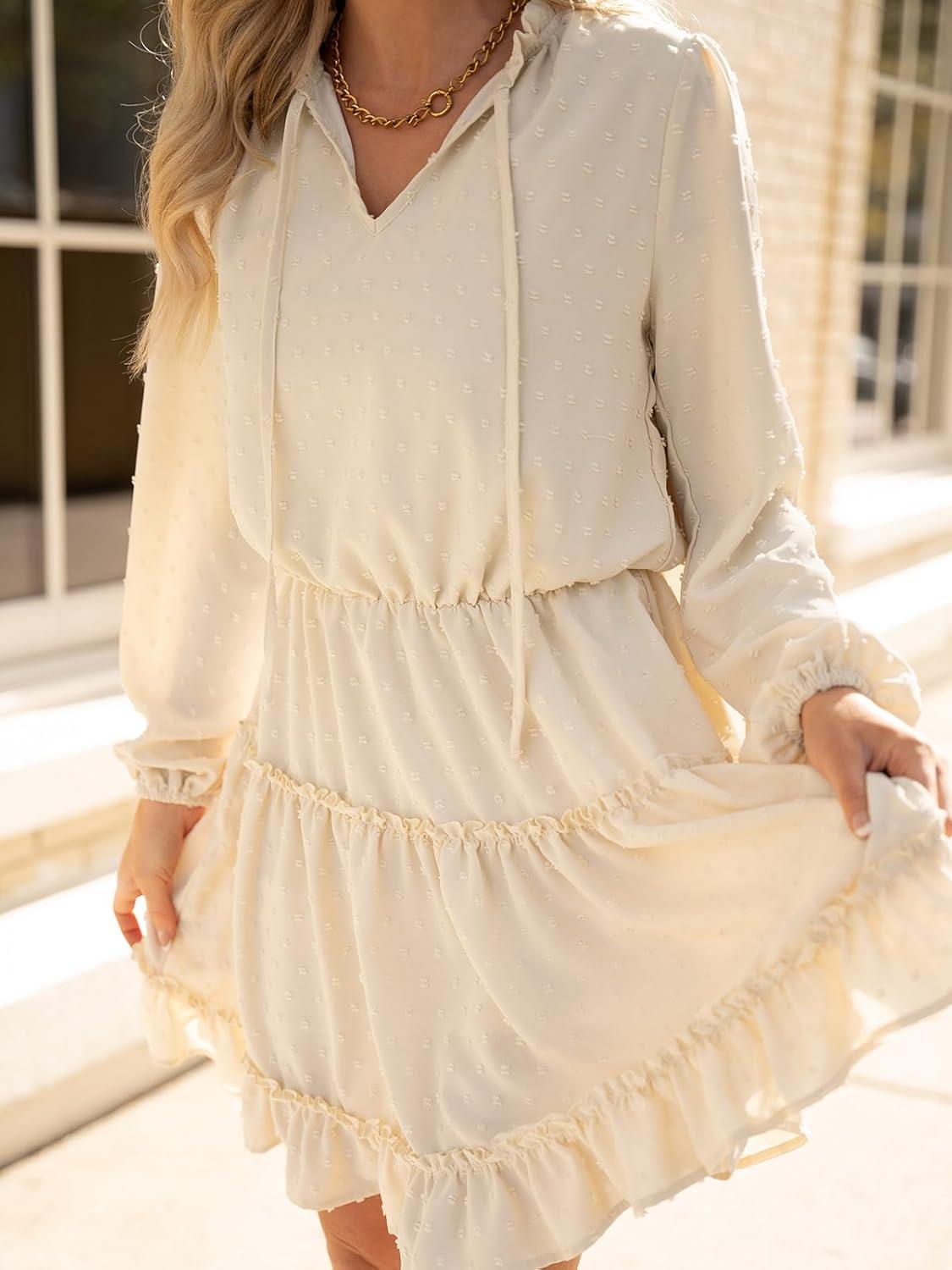 CUPSHE Women’s V Neck Pom Pom Long Sleeve Ruffled Drawstring A Line Mini Dress Green(Beige)