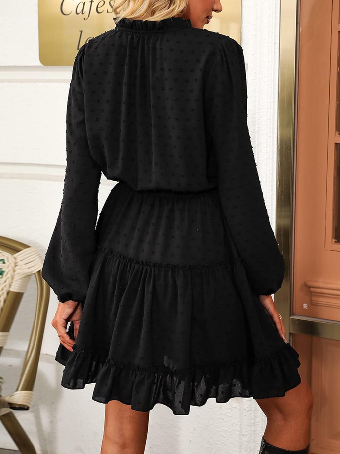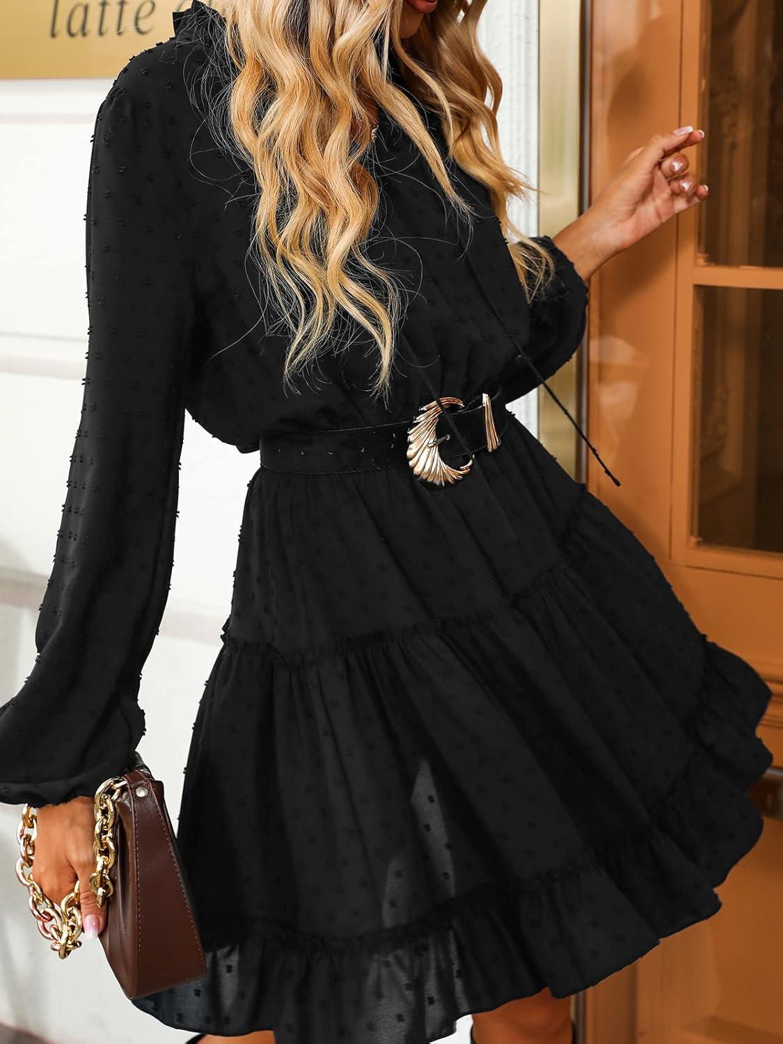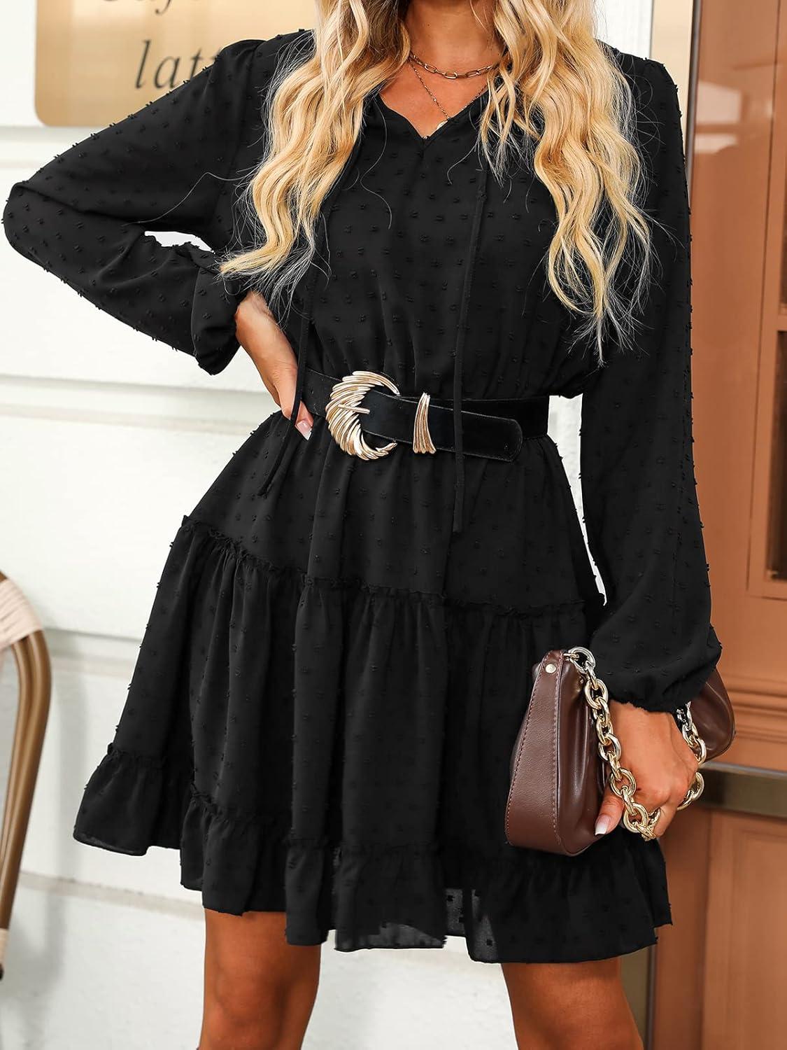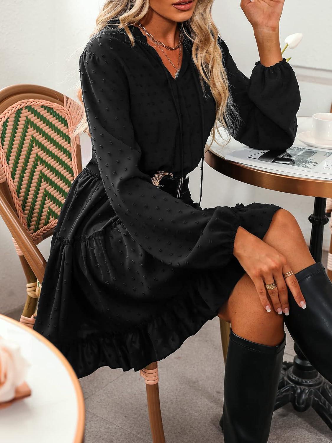 CUPSHE Women’s V Neck Pom Pom Long Sleeve Ruffled Drawstring A Line Mini Dress Green(Black)