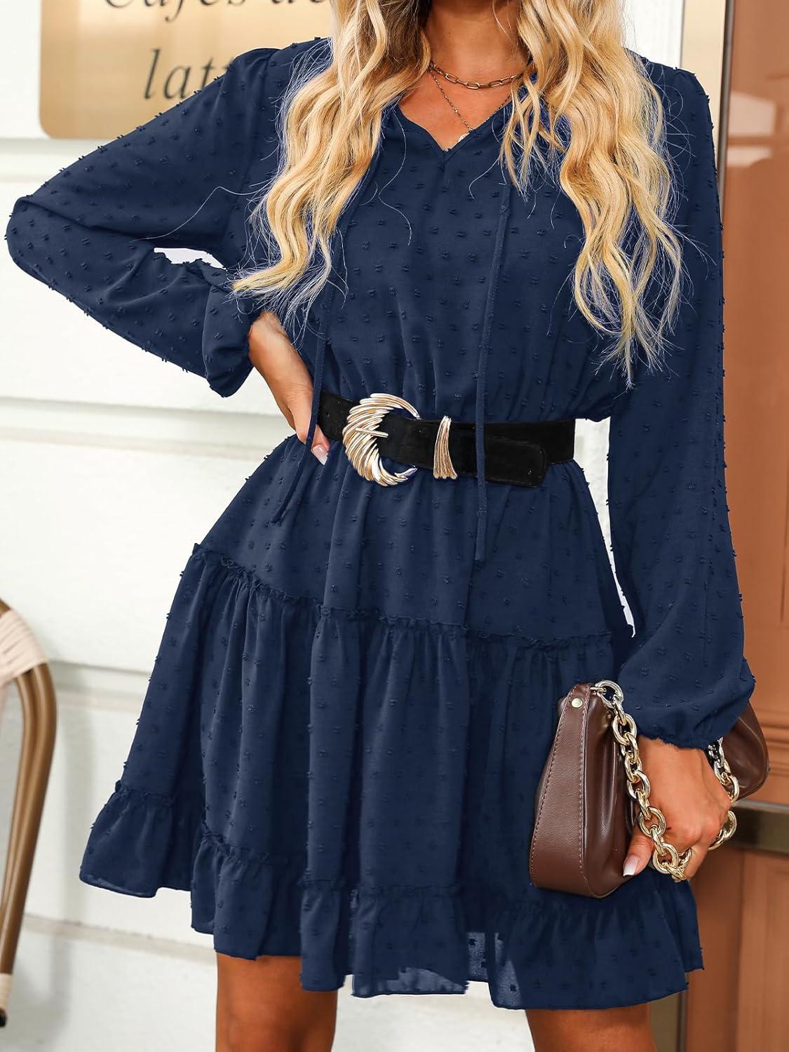 CUPSHE Women’s V Neck Pom Pom Long Sleeve Ruffled Drawstring A Line Mini Dress Green(Blue)