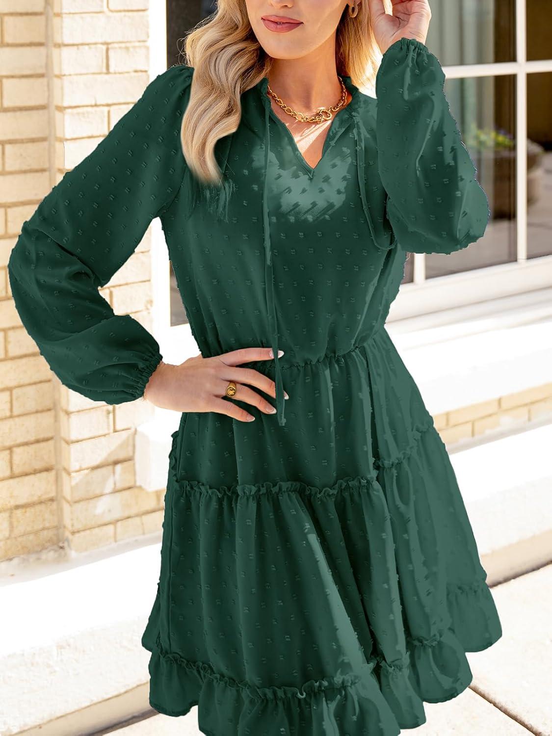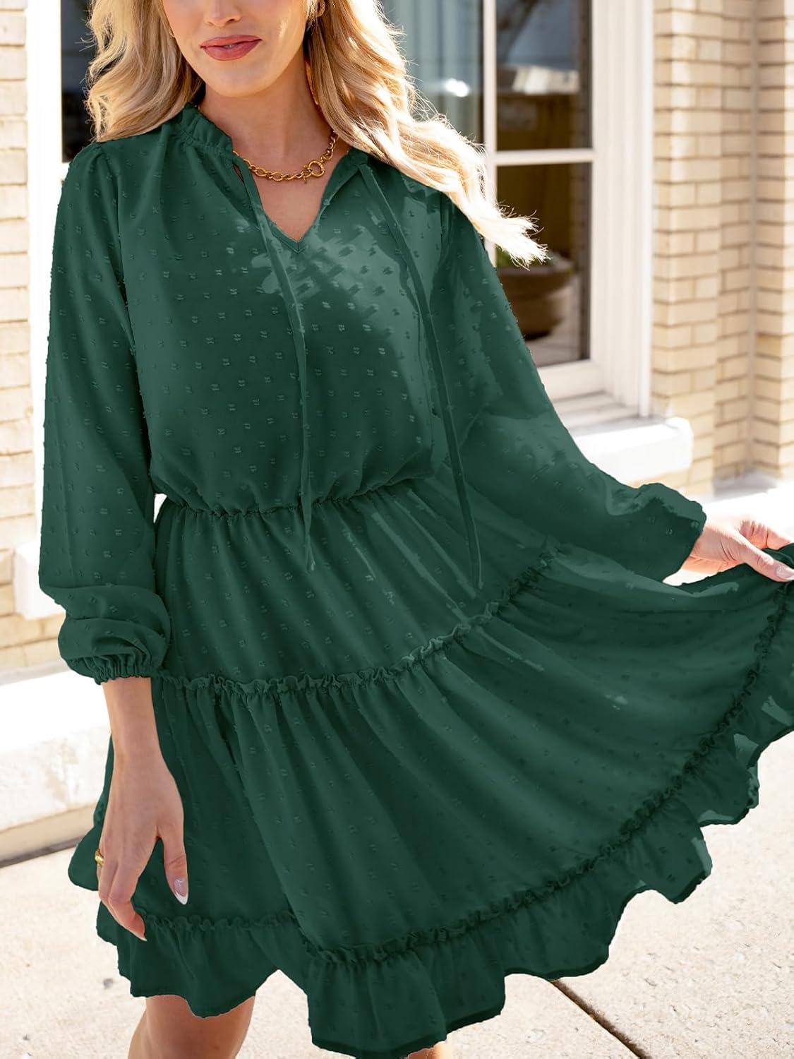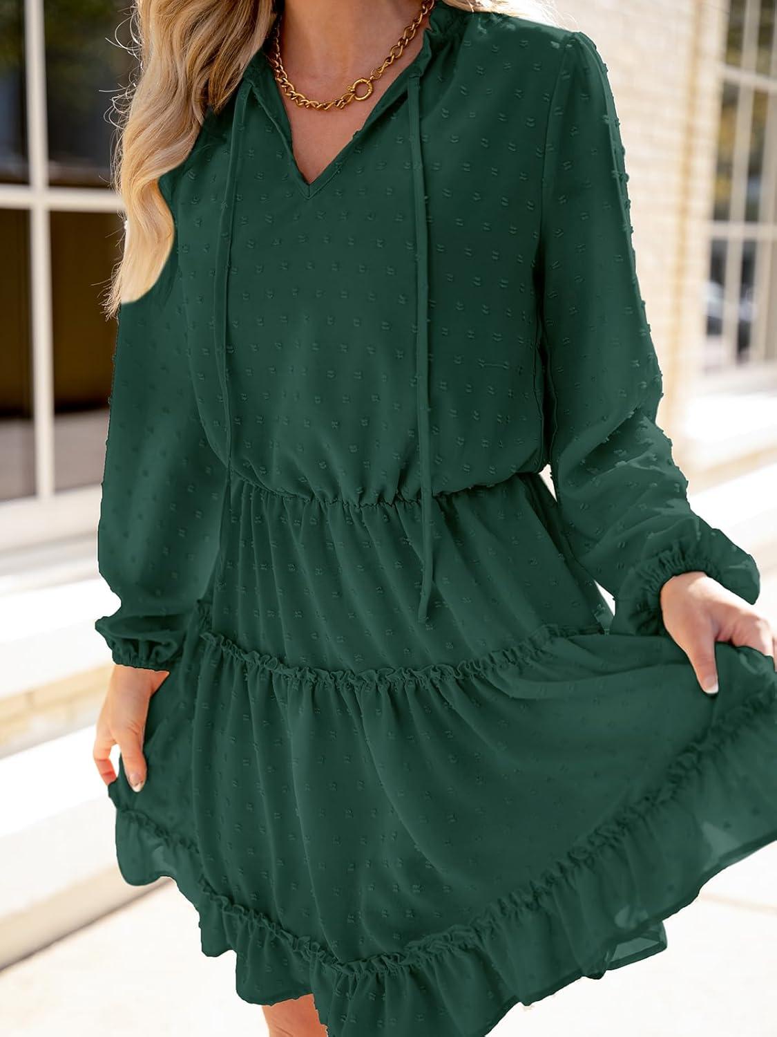 CUPSHE Women’s V Neck Pom Pom Long Sleeve Ruffled Drawstring A Line Mini Dress Green(Green)