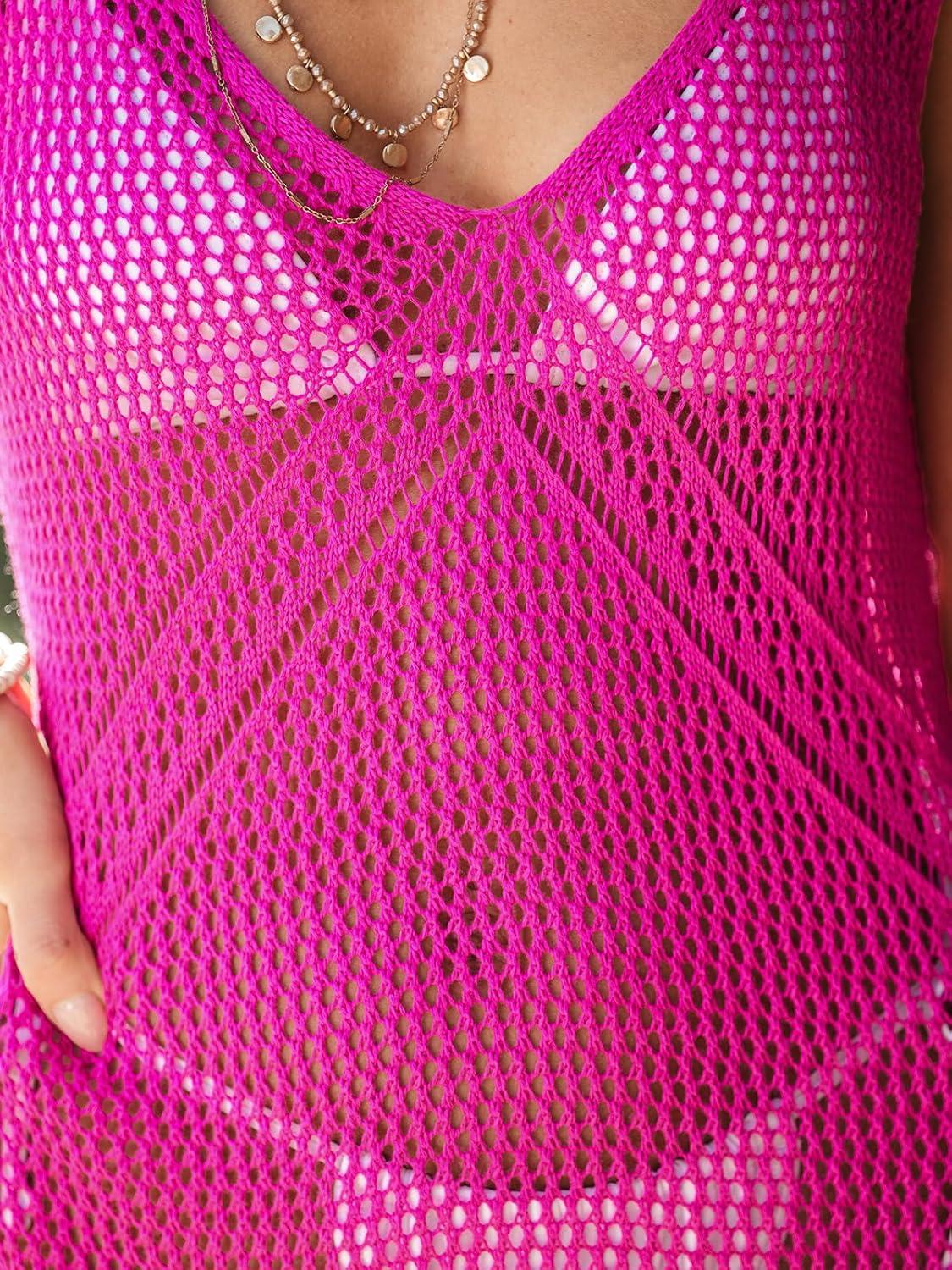 CUPSHE Women Crochet Swimsuit Cover Up Sleeveless Hollow Out Long Swimwear Coverup 2026 Split Mesh Beach Dress(Hot Pink)