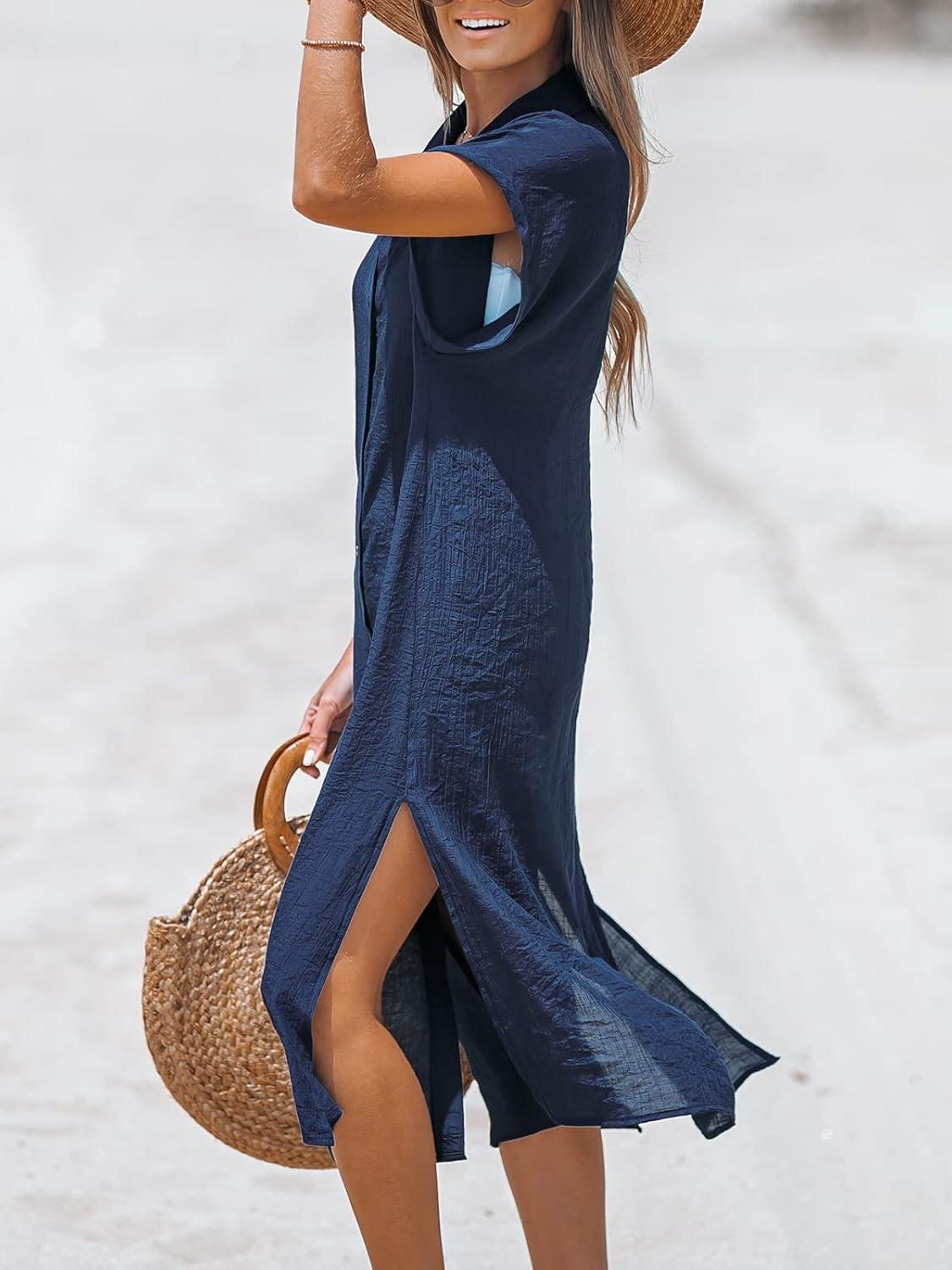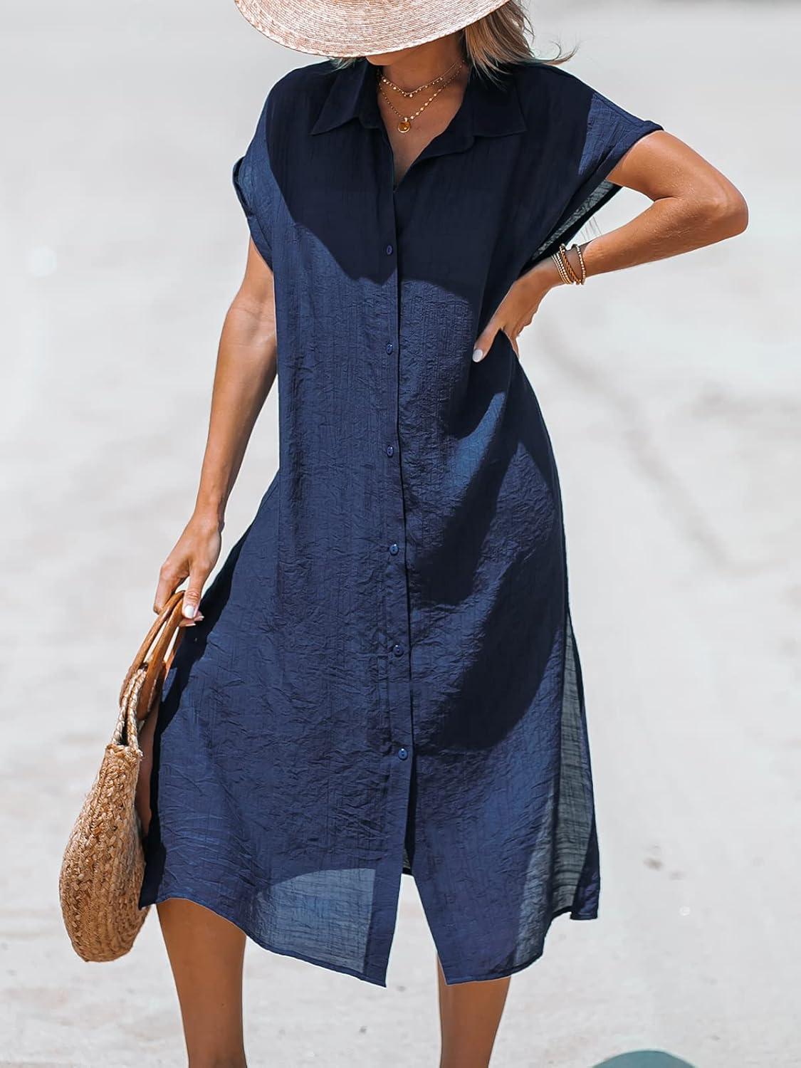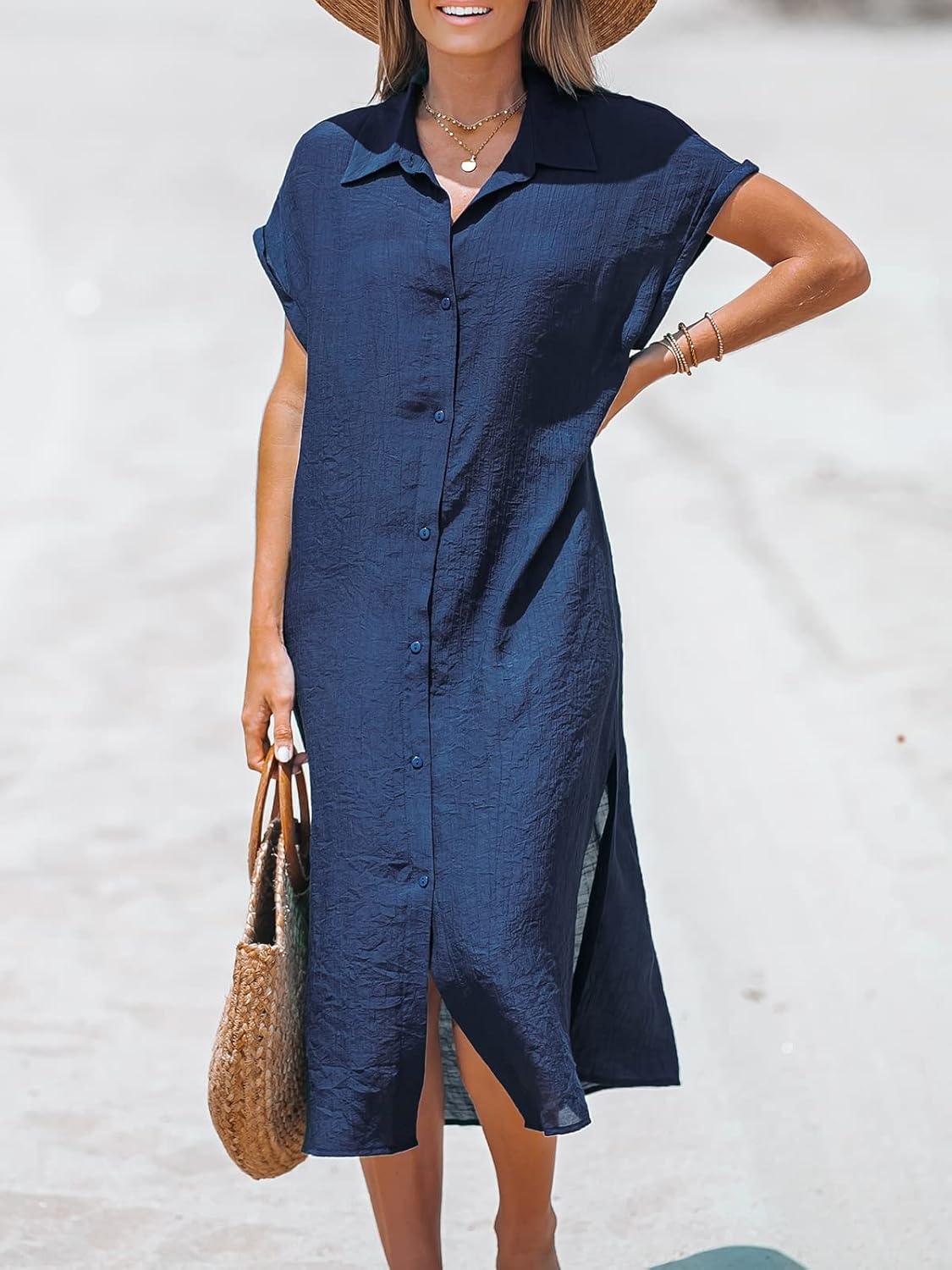 CUPSHE Women Buttoned Cover-Up Shirt Dress Summer Short Sleeve Split Midi Dresses(Dark Blue)