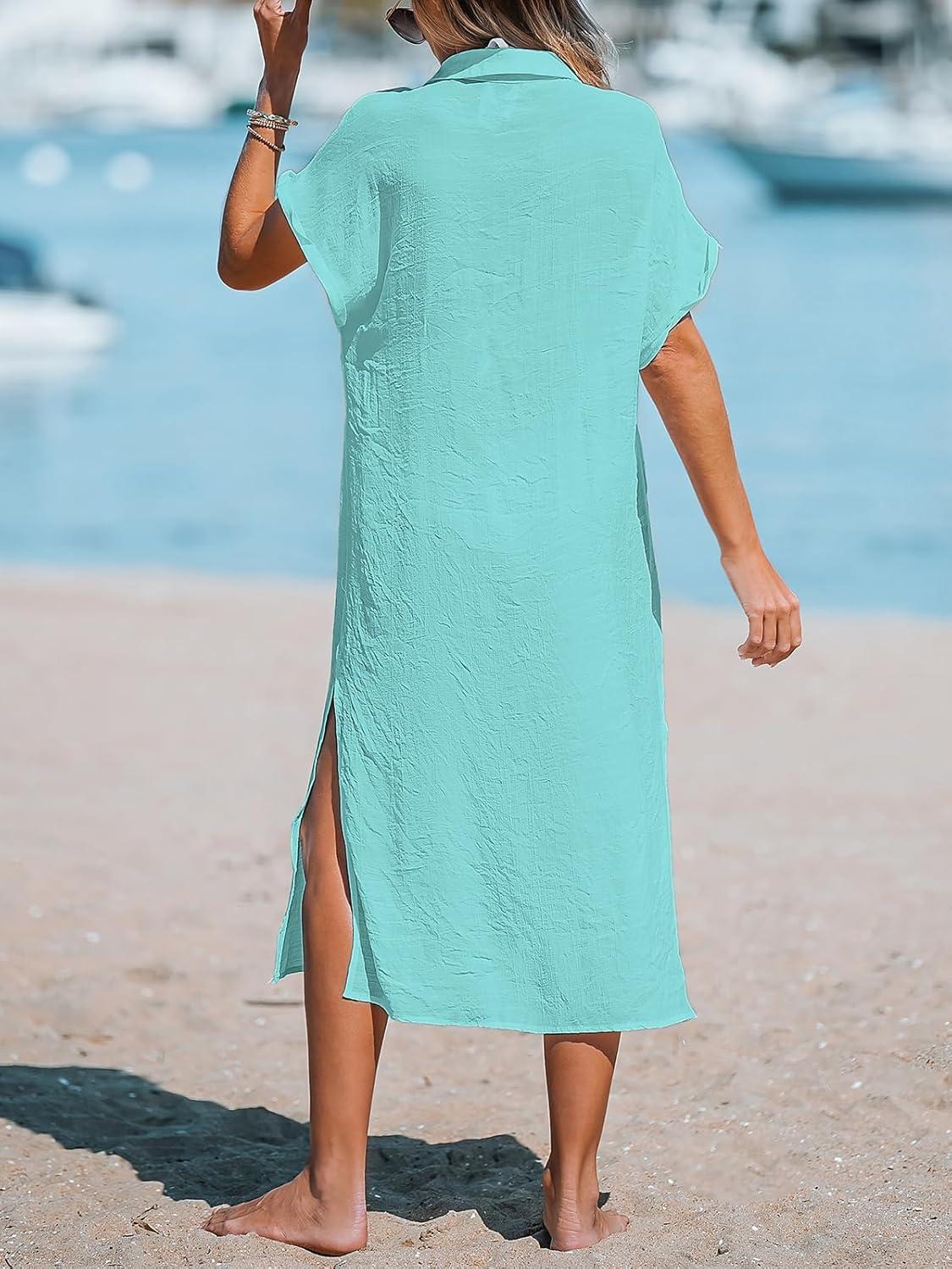CUPSHE Women Buttoned Cover-Up Shirt Dress Summer Short Sleeve Split Midi Dresses(Light Green)