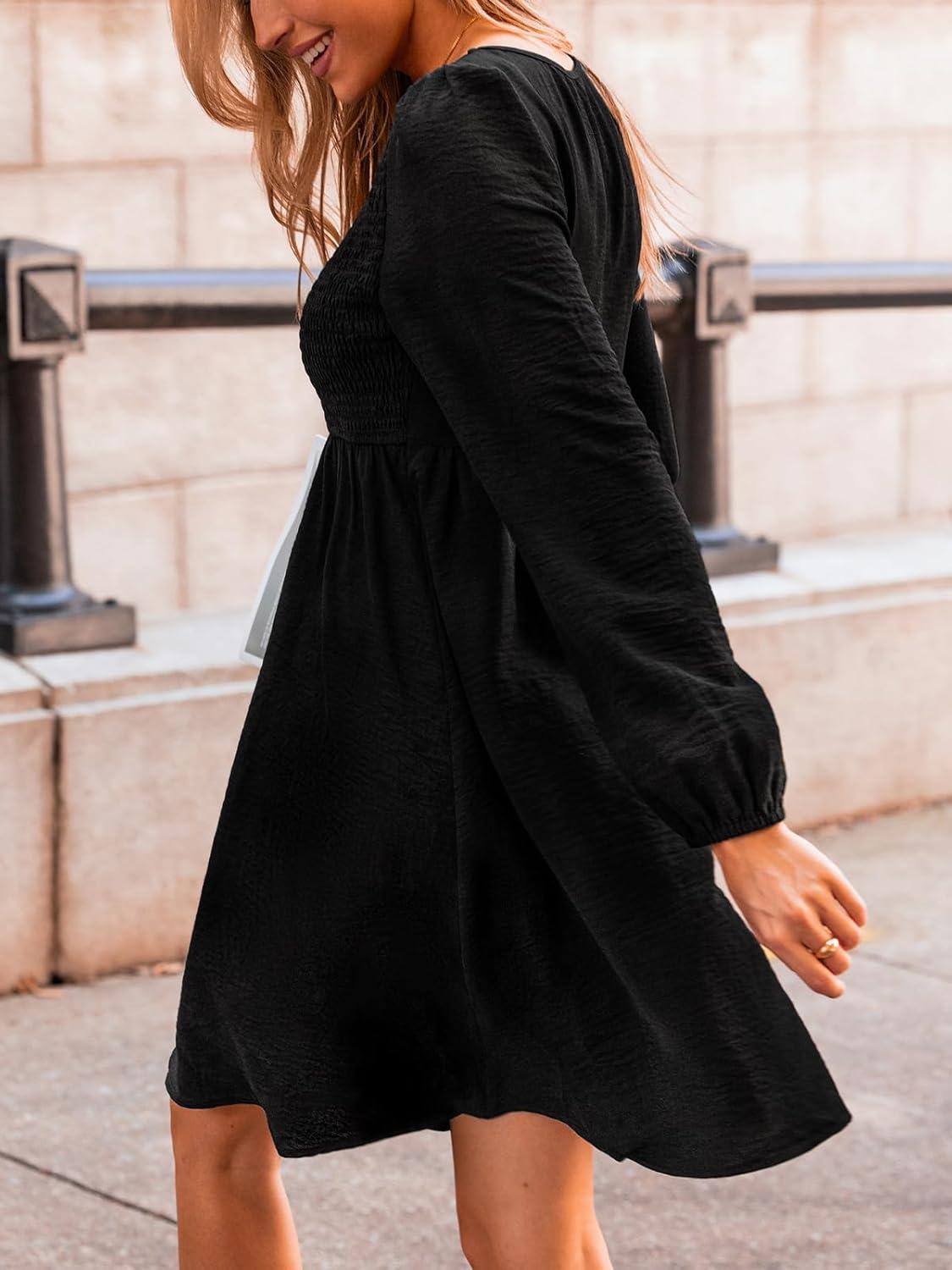 CUPSHE Womens Smocked Mini Dress Round Neck Long Sleeves Fall Casual Ruffle Dress(Black)