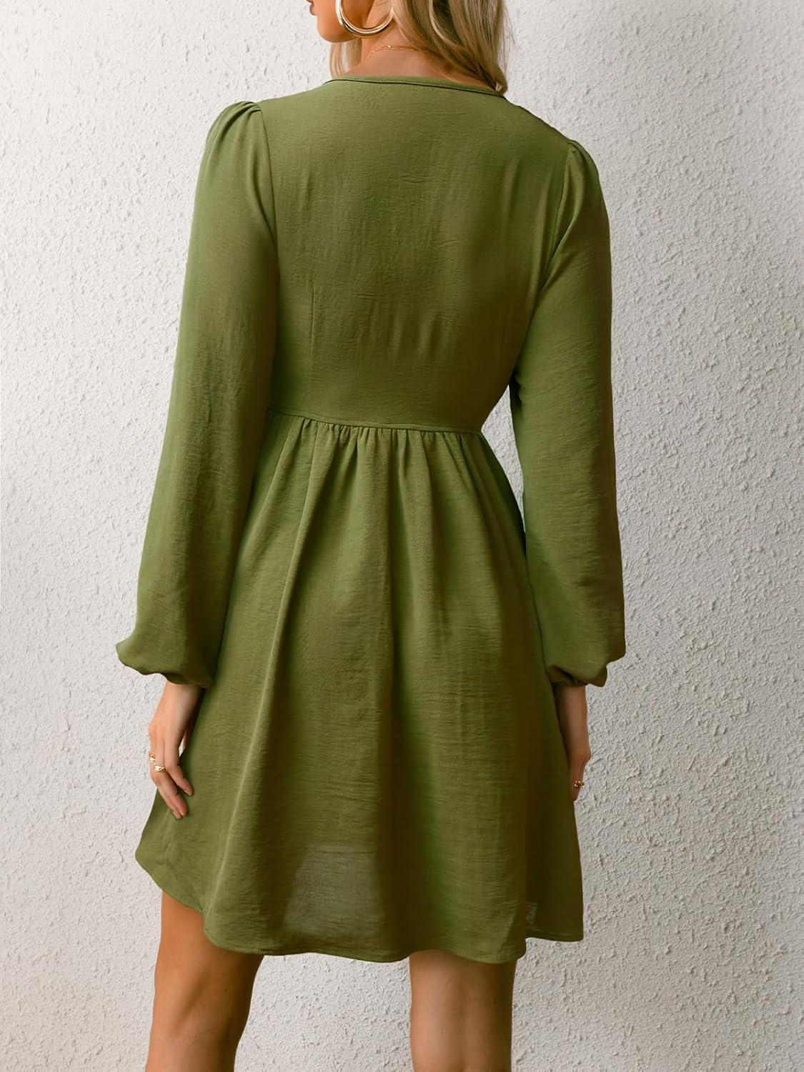 CUPSHE Womens Smocked Mini Dress Round Neck Long Sleeves Fall Casual Ruffle Dress(Green)
