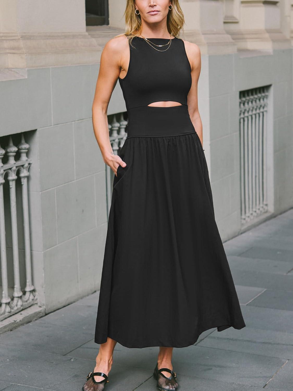 CUPSHE Summer Dress for Women 2025 Formal Sleeveless Round Neck Cutout Pockets Casual A Line Maxi Dress(Black)