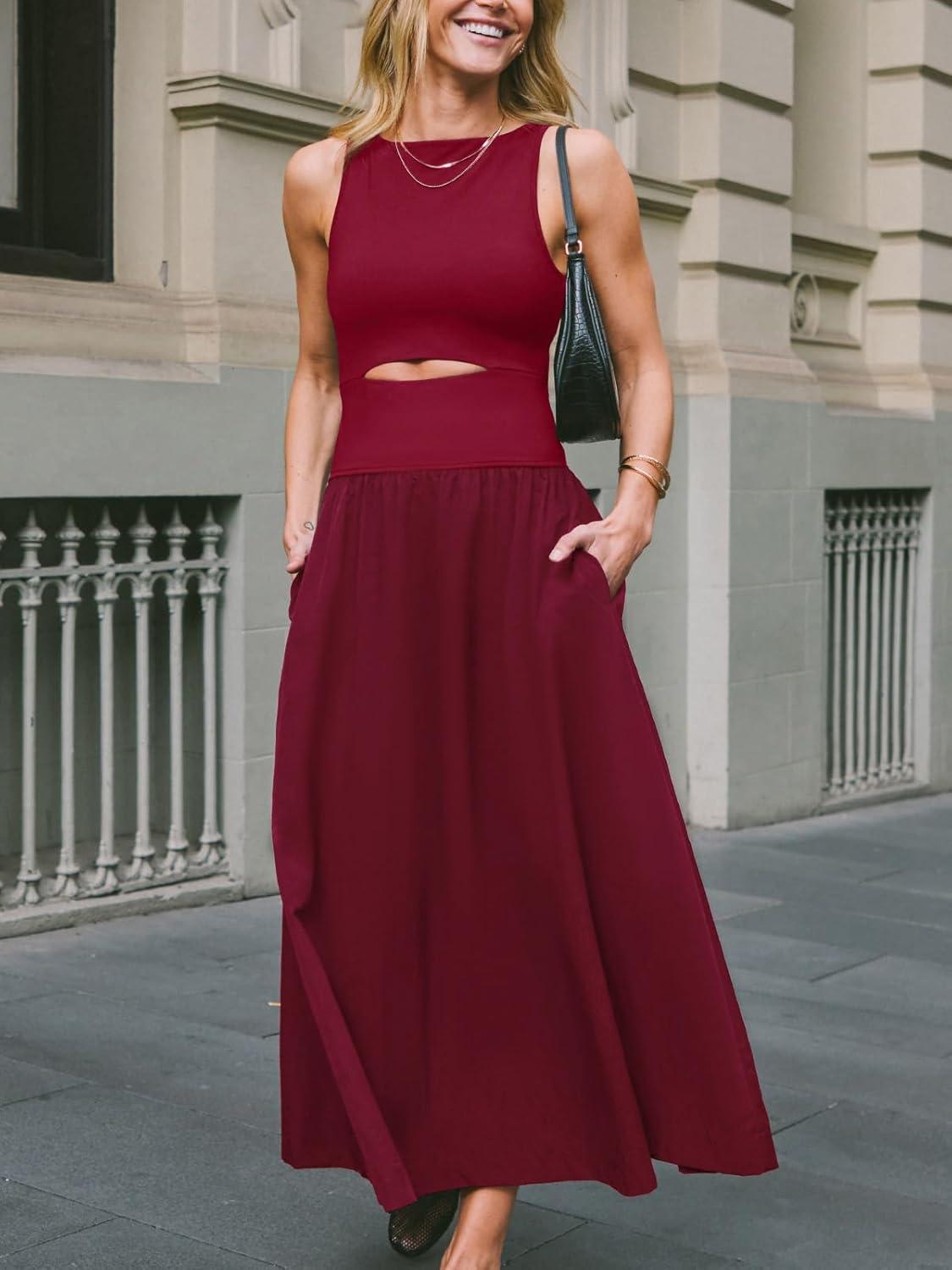 CUPSHE Summer Dress for Women 2025 Formal Sleeveless Round Neck Cutout Pockets Casual A Line Maxi Dress(Burgundy)
